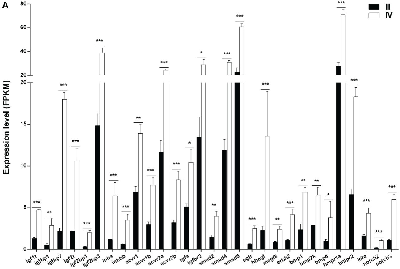 Histogram showing the selected differentially expressed genes (log2 (FC) >1 and FDR <0.05) involved in paracrine signaling in stage III and IV ovary of S. argus. The data is based on the FPKM values obtained from the RNA-seq data. *, P<0.05; **, P<0.01; ***, P<0.001.