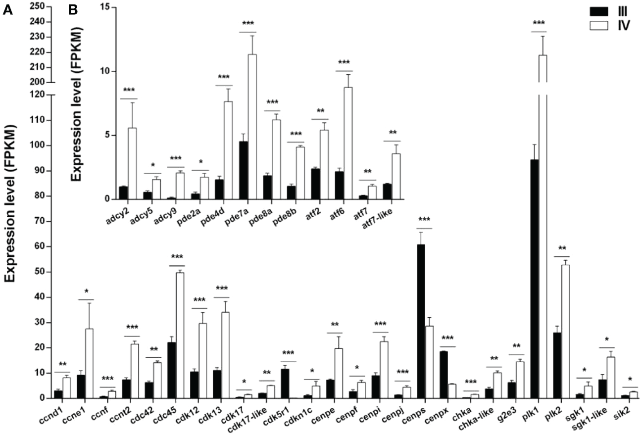 The expression of 38 genes potentially involved in the meiotic arrest and resumption was examined using the transcriptomic data (Supplementary Table S11) (Meng et al., 2022). The genes were divided into two categories: genes associated with cell cycle and meiosis (Figure 9A) and those associated with cAMP or cGMP synthesis and hydrolysis (Figure 9B). Of note, 23 (ccnd1, ccne1, ccnf, ccnt2, cdc42, cdc45, cdk12, cdk13, cdk17, cdk17-like, cdkn1c, cenpe, cenpf, cenpi, cenpj, chka, chka-like, g2e3, plk1, plk2, sgk1-like, and sik2) of the 26 genes associated with cell cycle and meiosis were up-regulated, while the other three genes (cdk5r1, cenps, and cenpx) were down-regulated in stage IV compared to stage III. Moreover, all the 12 genes (adcy2, adcy5, adcy9, pde2a, pde4d, pde7a, pde8a, pde8b, atf2, atf6, atf7, and atf7-like) related to cAMP or cGMP synthesis and hydrolysis were up-regulated.