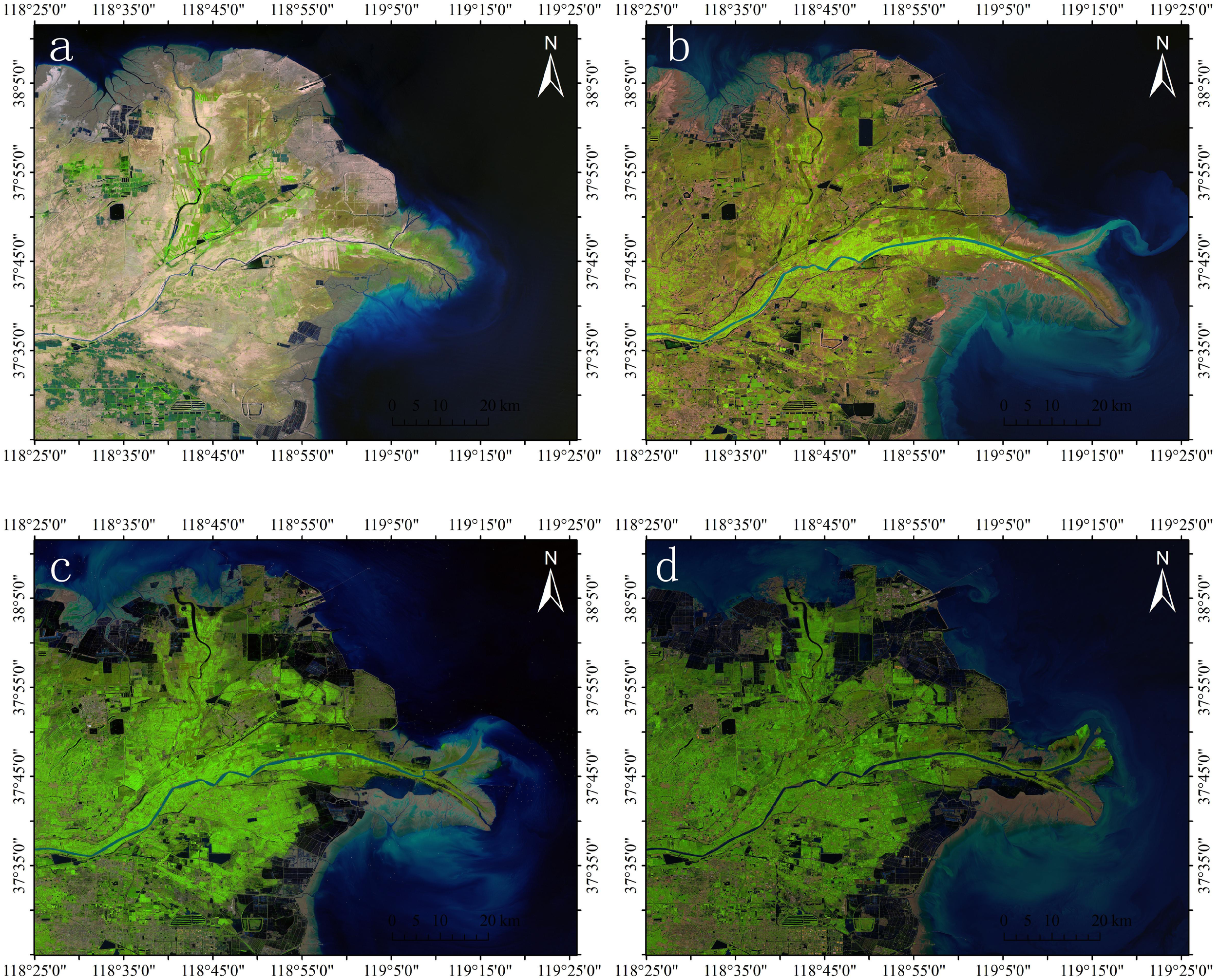 The modern Yellow River Delta (YRD) is one of the youngest, most extensive, and most biodiverse estuarine coastal wetlands in China’s warm temperate region (Chu et al., 2006; Li et al., 2009; Li et al., 2013; Chen et al., 2016). In recent years, human activities, changes in the water and sediment of the Yellow River, and coastal erosion have impacted the landscape of the Yellow River Delta (YRD), leading to complex and dramatic changes in landscape types and an increased rate of landscape evolution. This makes the study of the evolution of the YRD’s landscape pattern significant (Ottinger et al., 2013; Meng et al., 2017; Cong et al., 2019). Currently, research on the landscape patterns of the Yellow River Delta (YRD) has mainly focused on quantifying the area and landscape index (Cabral and Costa, 2017), lacking sufficient clarity in the spatial expression of changes in the YRD’s landscape pattern. Moreover, many studies have analyzed the changes in the overall landscape pattern of the YRD (e.g., Chu et al., 2006; Ottinger et al., 2013; Cong et al., 2019). The impact of river and shoreline changes on the YRD landscape pattern is under-researched, particularly the impact of abandoned channels and shorelines. Studying their influence on the landscape pattern over time creates a scientific basis for future research on the evolution and driving forces of the YRD landscape pattern.