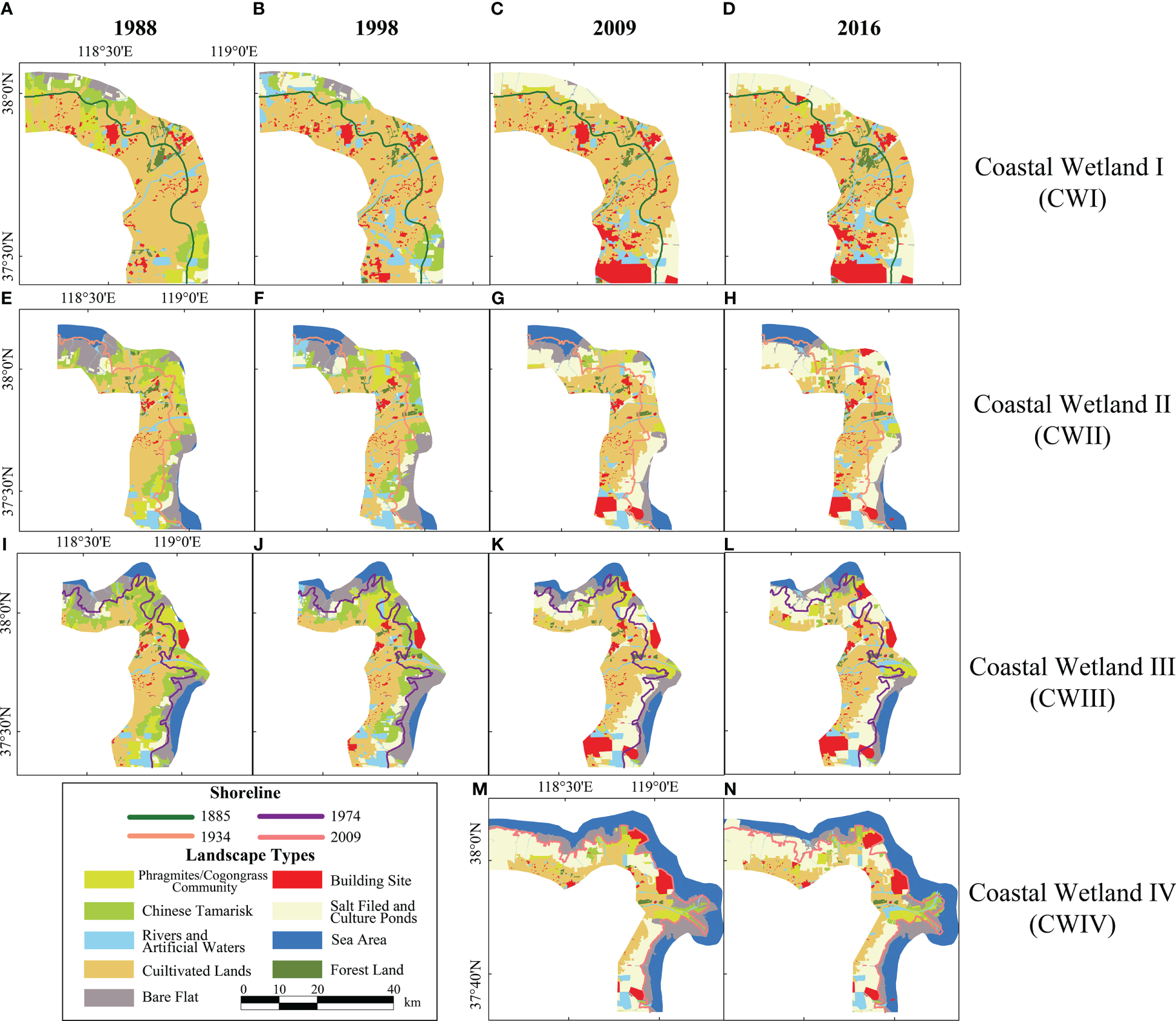 Maps of the distributions of the landscape types in coastal wetlands CWI (A-D), CWII (E-H), CWIII (I-L), and CWIV (M, N).