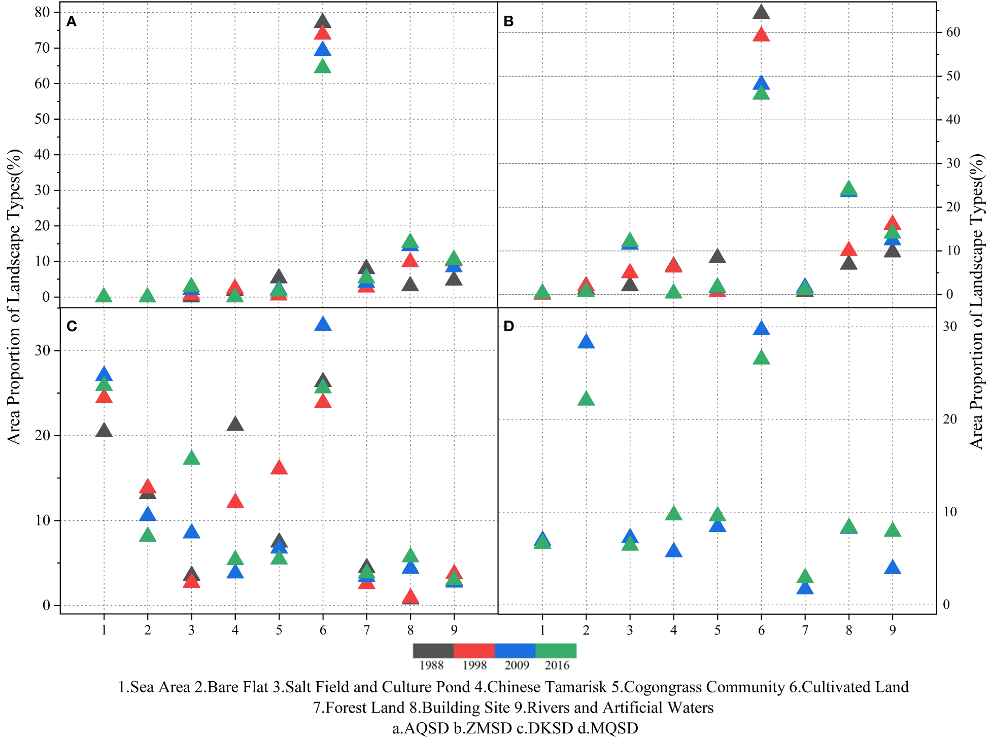 In the DKSD region, the proportion of sea area, bare flats, salt fields, culture ponds, and Chinese tamarisk and Suaeda glauca communities showed significant changes of more than 5%, while the proportion of other landscape types varied by less than 5%. The Chinese tamarisk and Suaeda glauca communities showed the greatest changes, with a decrease from 21.16% in 1988 to 5.36% in 2016.