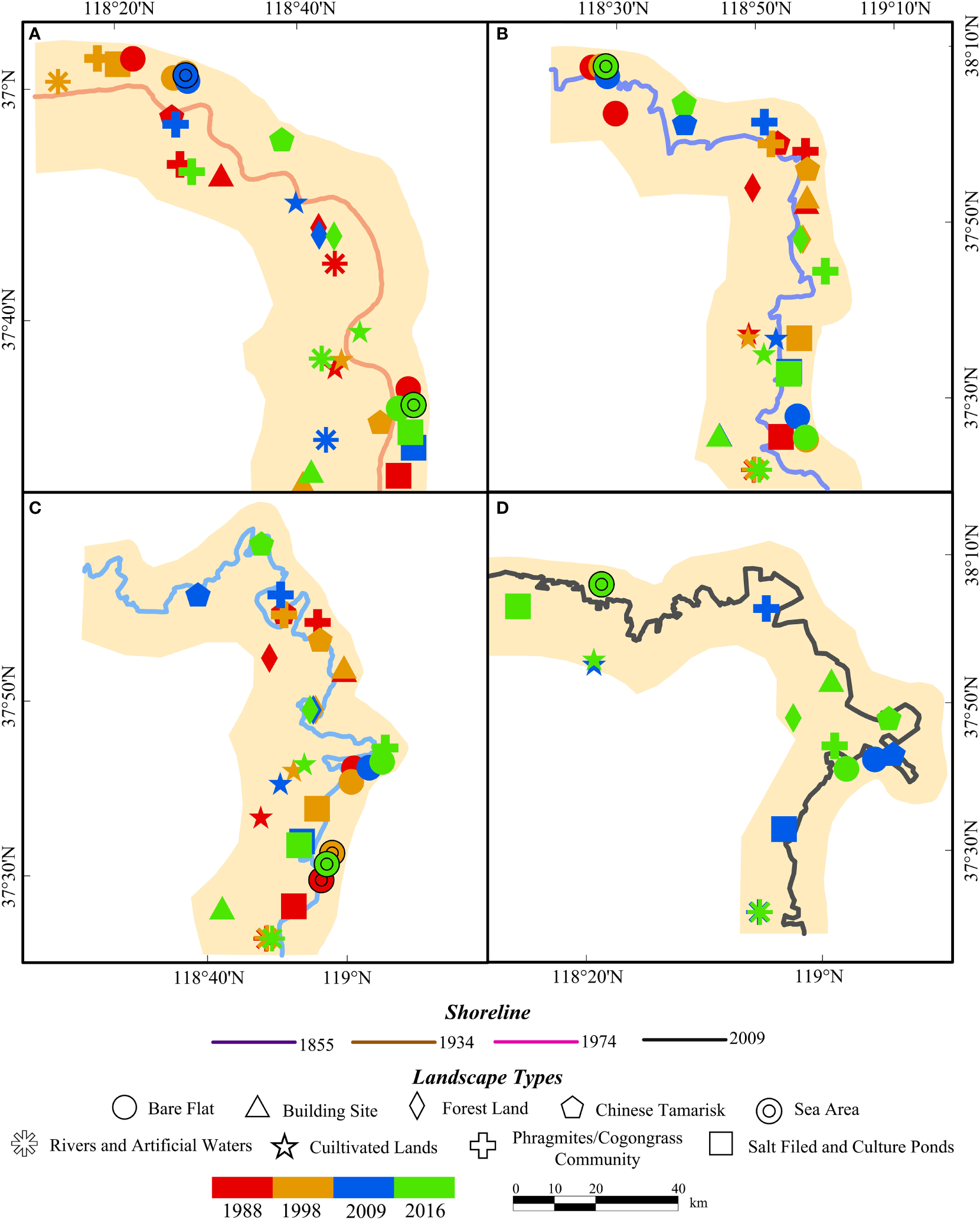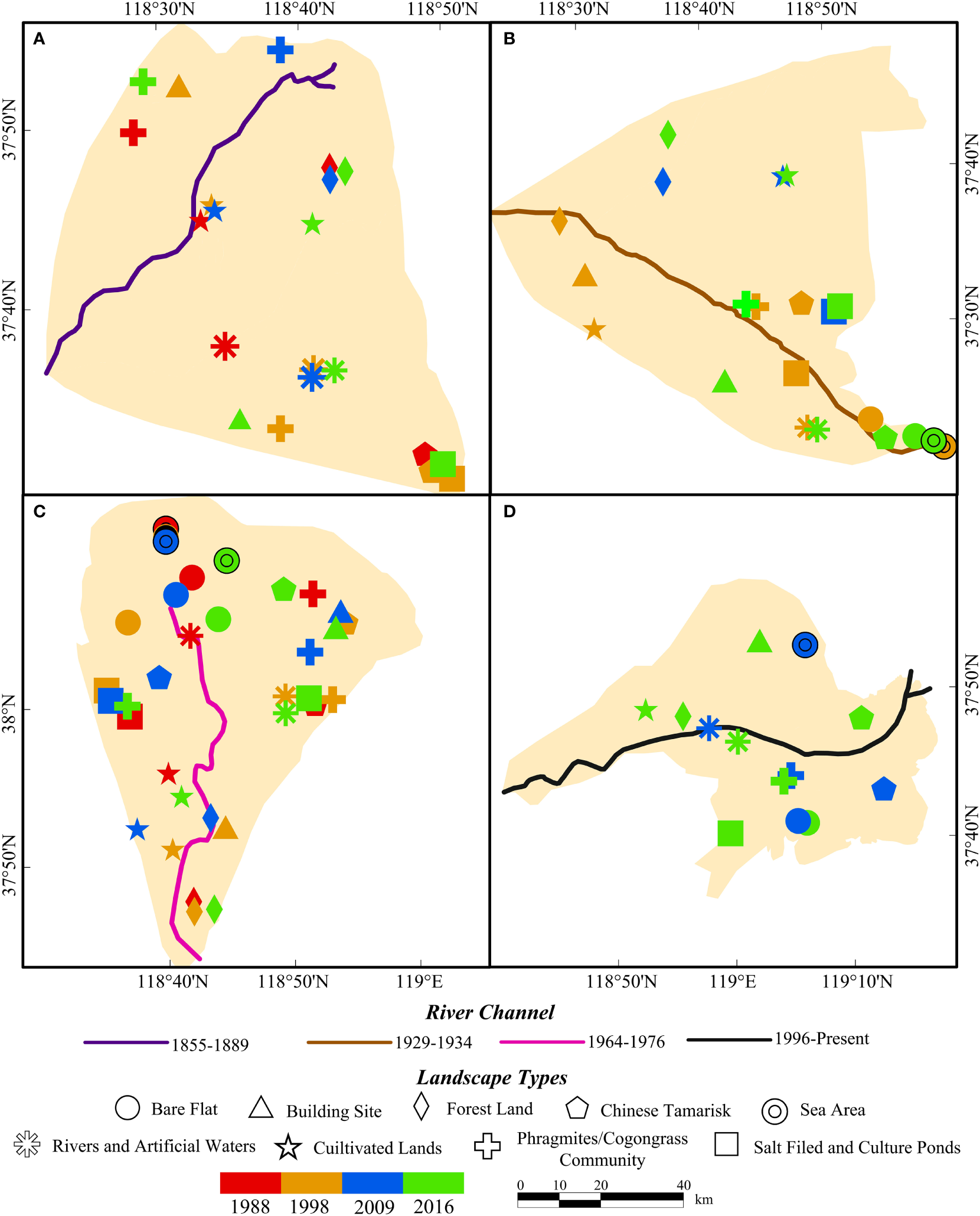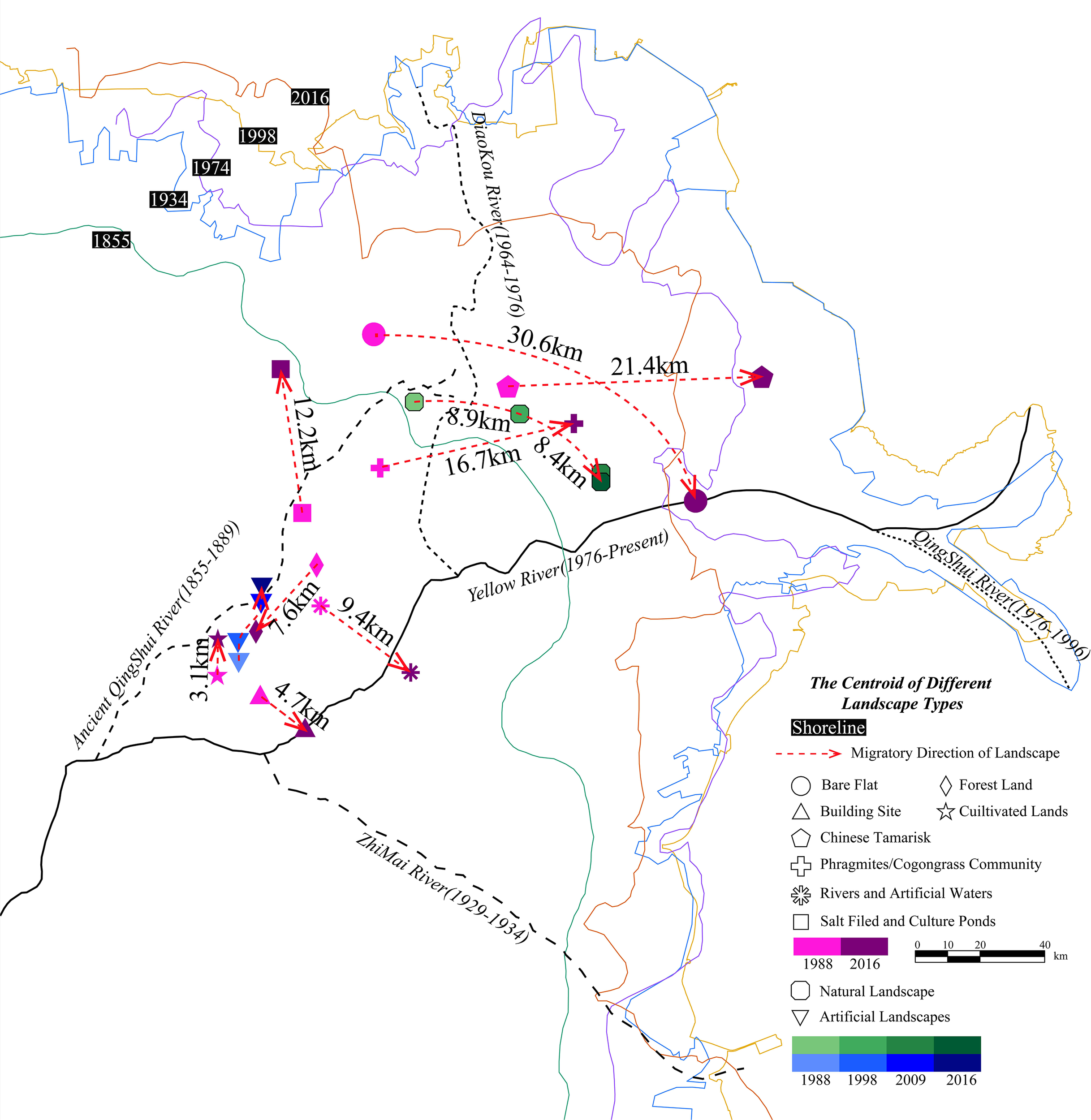 This paper mainly explored the influence of the Yellow River channel and coastline evolution on the landscape pattern of the YRD according to the landscape characteristics and succession in the YRD. The subdeltas and coastal wetlands in the different periods were superimposed onto the landscape structure maps for 1988, 1998, 2009, and 2016. Then, we obtained the landscape pattern distribution of the subdeltas and coastal wetlands of the YRD in different periods (Figures 3, 4), and the ratio of the area of each landscape type to the total area was calculated. We obtained a map of the proportions of the total area of the subdelta and coastal wetland landscapes in the different periods (Figures 5, 6). We extracted the regional centroids of the subdelta and coastal wetland landscapes in the different periods, and then the regional centroid was integrated into a Geo-informatic Tupu to explore the landscape succession characteristics (Figures 7, 8).