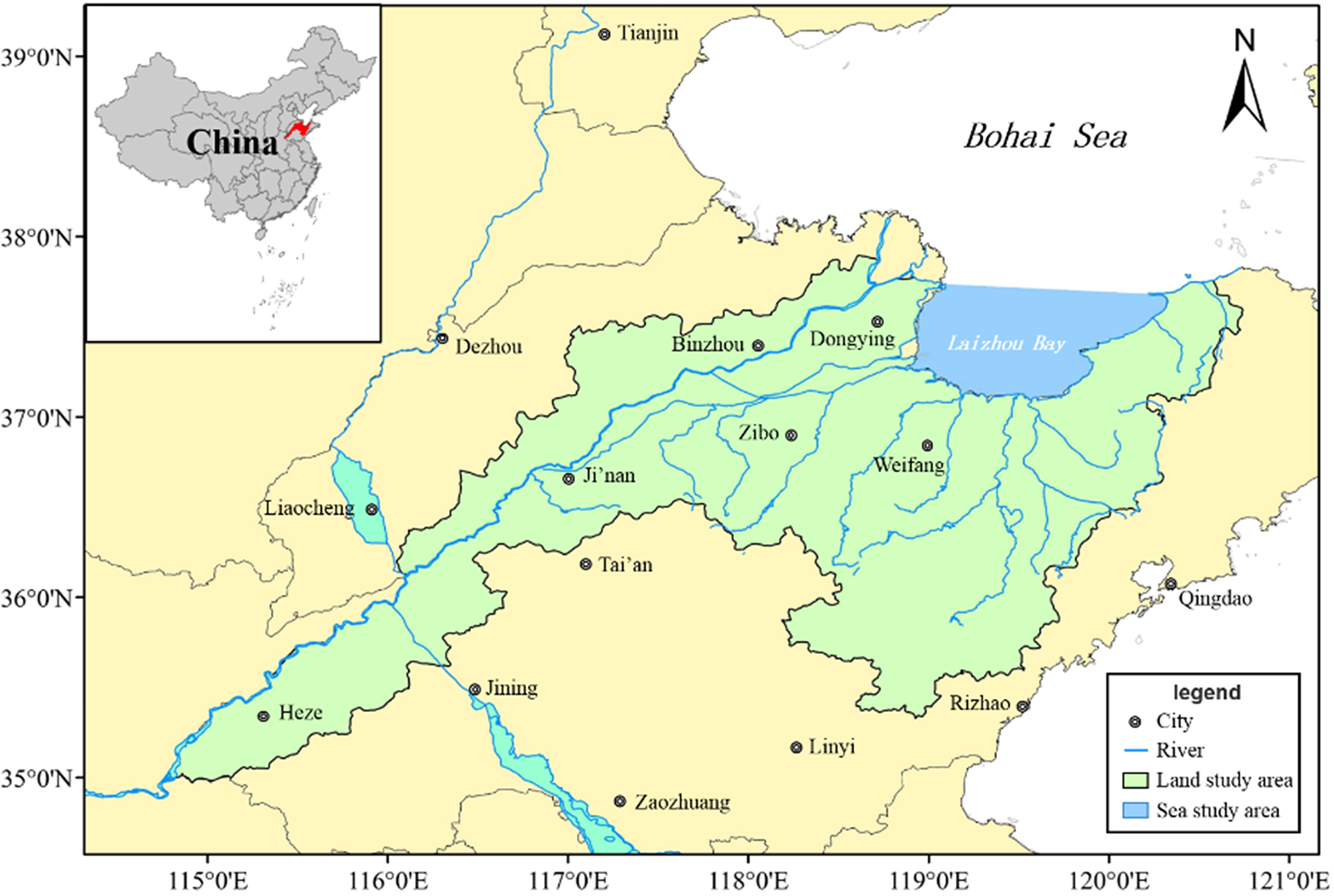The study area consists of both sea and land areas, as shown in Figure 1. The sea study area covers the entire LZB (36°25′~37°45′N, 118°17′~120°45′E), including the Yellow River estuary in the west of the bay, which is a typical semi-enclosed bay with a coast length of 319.06 km and bay area of 6966.93 km2 (Li et al., 2007; Zhao et al., 2016). The basin of rivers discharged into LZB covers a total of 51 counties (districts and county-level cities) belonging to 14 prefecture-level cities in Shandong Province, which are taken as the land study area.