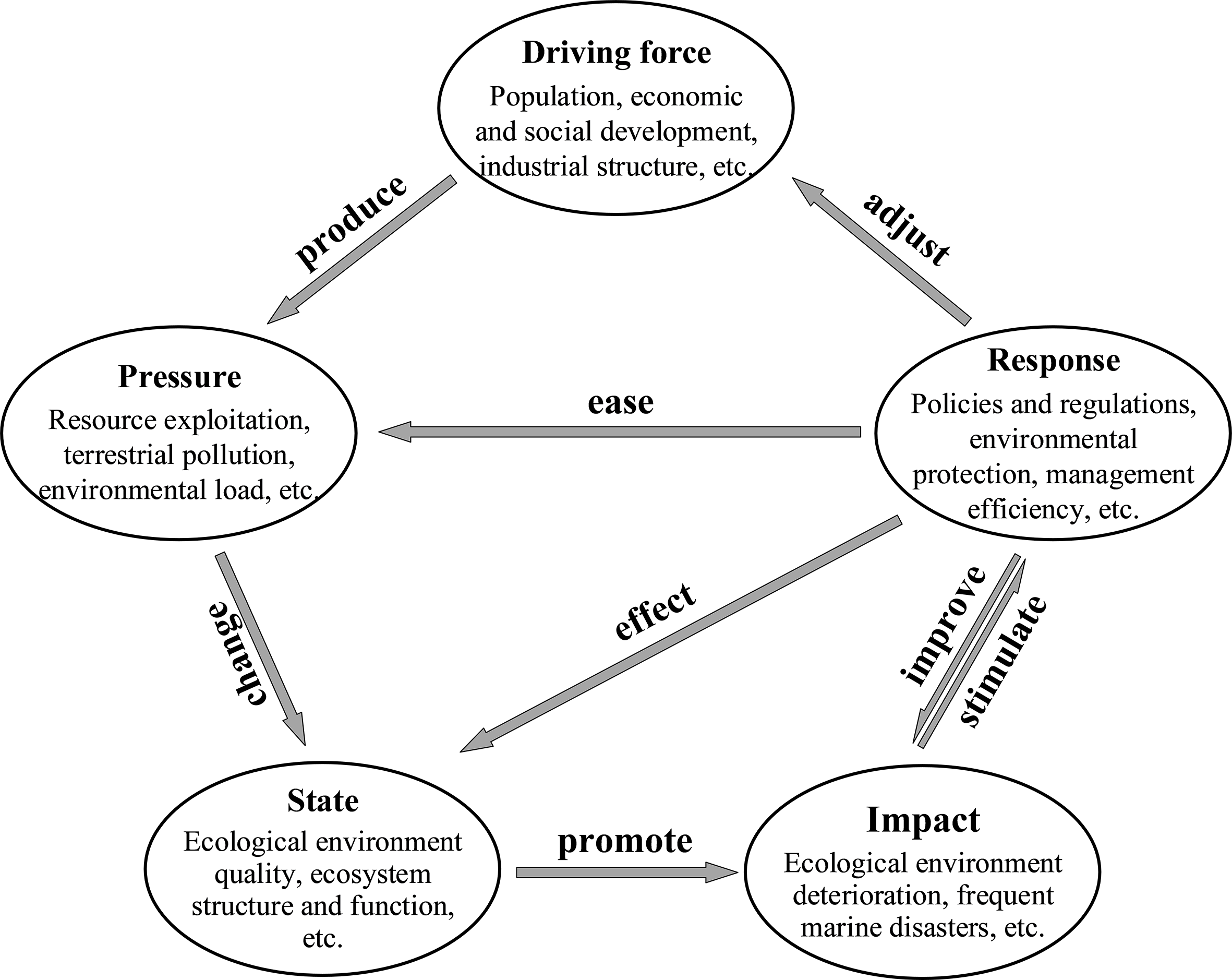 The indicator framework method is based on the selection of appropriate evaluation indicators, the clarification of indicator weights, and the determination of appropriate evaluation criteria (Quan and Zhu, 2011). The indicator framework can systematically illustrate the evolution process of the ecosystem as well as fully reflect its complexity of structure and function, which is helpful for assessing the health status of the regional ecosystem in a comprehensive matter. The Pressure-State-Response (PSR) model, jointly developed by the Organization for Economic Co-operation and Development (OECD) and the United Nations Environment Programme (UNEP), is one of the most widely used conceptual framework and report tools (OECD, 1993; Hammond, 1995; UNEP, 2006). The PSR model answers the following three questions: what happened, why it happened and how humans should respond. Pressure indicators (P) describe human activities that can affect the marine ecosystem, representing the pressures caused by human activities on the environment. State indicators (S) reflect the ecosystem’s response on human activities, representing the status of environmental qualities and natural resources. Response indicators (R) refer to social actions to environmental and ecological problems (OECD, 1993; OECD, 2003; UNEP, 2006).