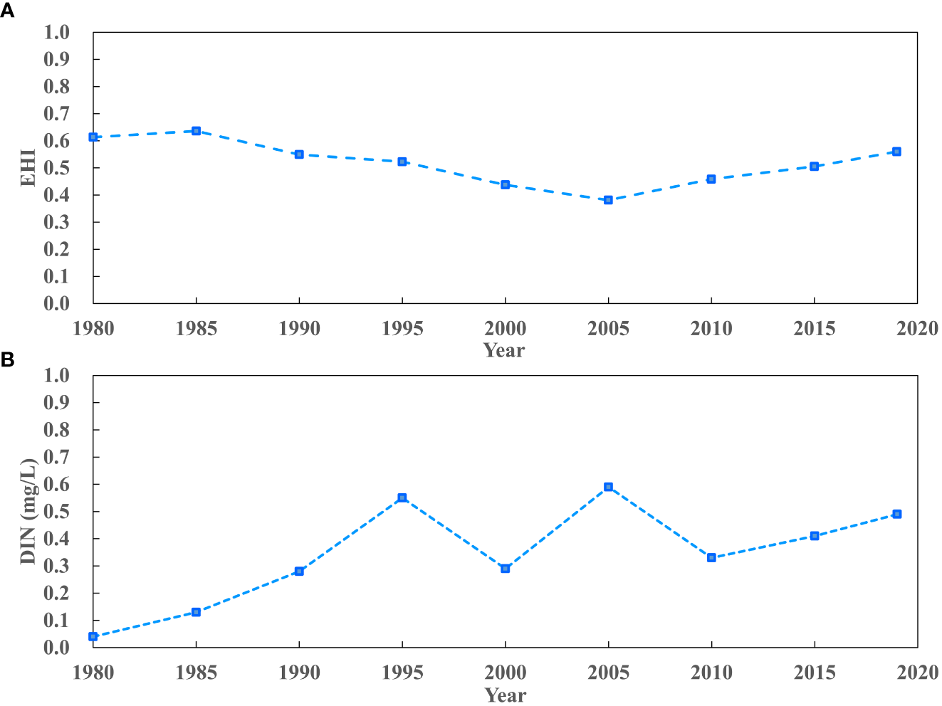 Laizhou Bay (LZB) is one of the three major bays in the Bohai Sea and the largest bay in Shandong Province, China (Wang et al., 2021). Since the 1980s, the rapid development of marine economy in LZB has been driven by its geographical location advantages, resources and environment endowment (Li et al., 2014). Now LZB has become a high-quality development strategic location for Shandong Province to promote the construction of a strong marine province. However, due to its dense population distribution and diverse human activities, there are many environmental and ecological problems, and the ecosystem health of this region is not optimistic. Therefore, it is of great importance to identify the evolution trend of its ecological environment and the key factors that affect the health of the LZB ecosystem.