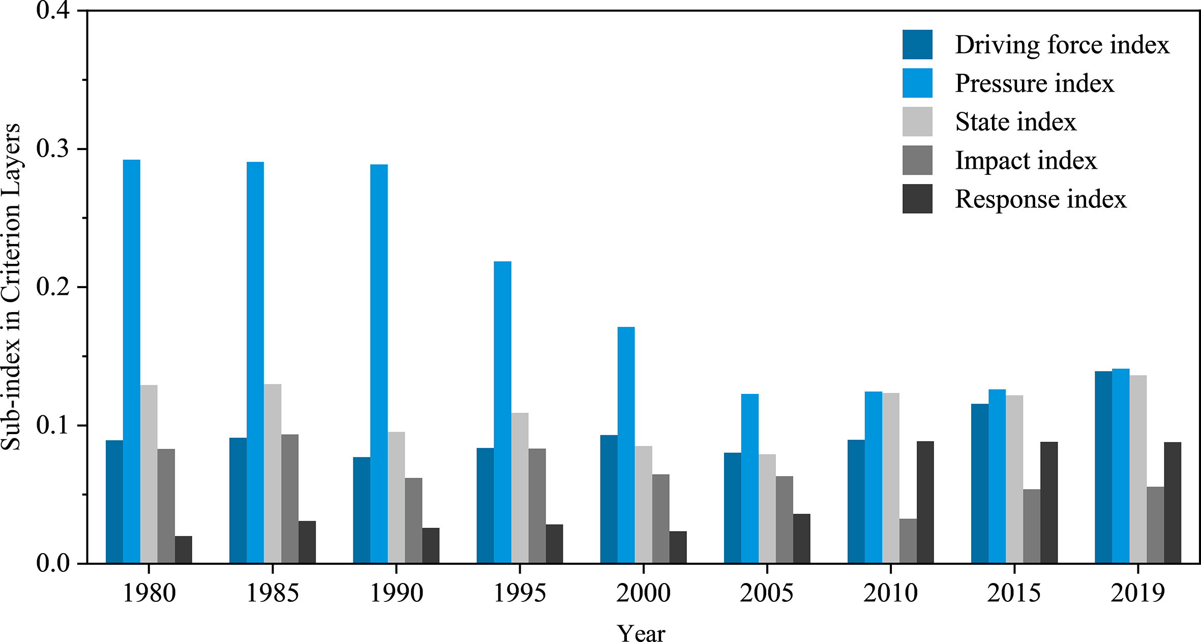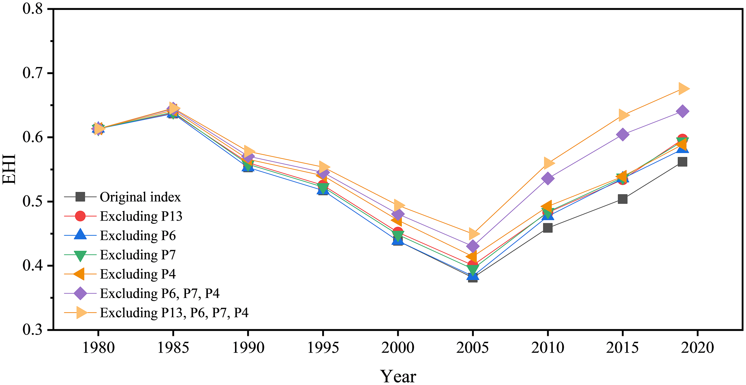 The Ecosystem Health Index (EHI) is calculated by the weighted summation of standardized indicator data, with a higher value indicating a higher health degree (Lu et al., 2013):