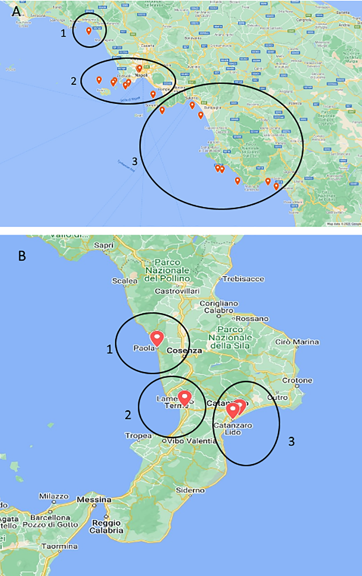 Maps of stranded Caretta caretta turtle (n = 195) sampling sites. In the circle, ChHV5-positive animal collection sites. (A) Campania region: 1, Caserta province; 2, Naples and islands; and 3, Salerno province. (B) Calabria region: 1, Cosenza province; 2, Vibo Valentia area; and 3, Catanzaro province.