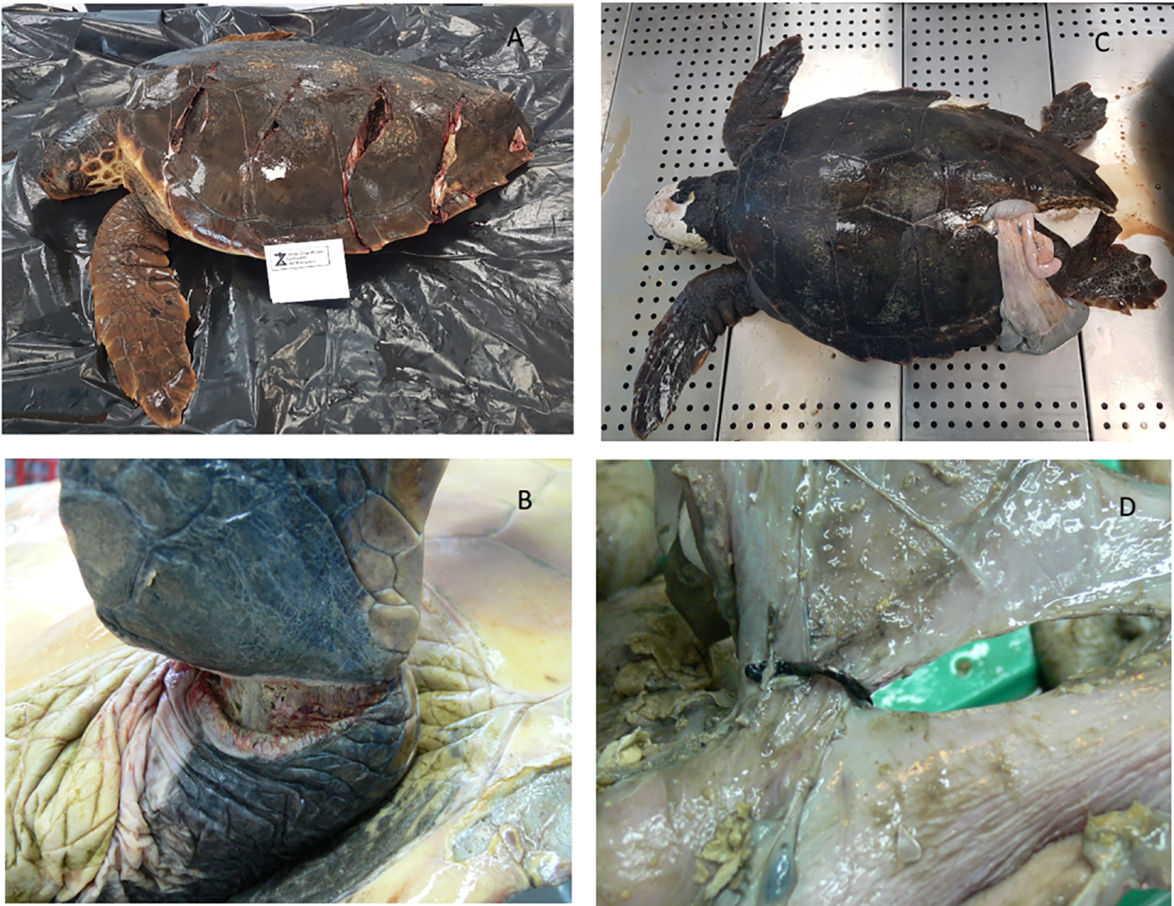 Animals with fatal wounds caused by anthropic impact. (A) Carapace fracture probably caused by the propeller of a boat. (B) Laceration at the basis of the fin likely determined by the entanglement of the animal in a net or a line. (C) Carapace fracture (with organ leakage) probably caused by a collision with a boat. (D) Laceration of the intestine caused by hook ingestion.