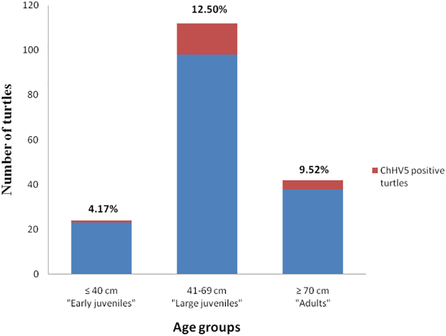 Prevalence of ChHV5 in the different age groups of sea turtles analysed. Histogram indicates the total number of turtles belonging to the age group, while the red part of it indicates the number of turtles positive for the virus.