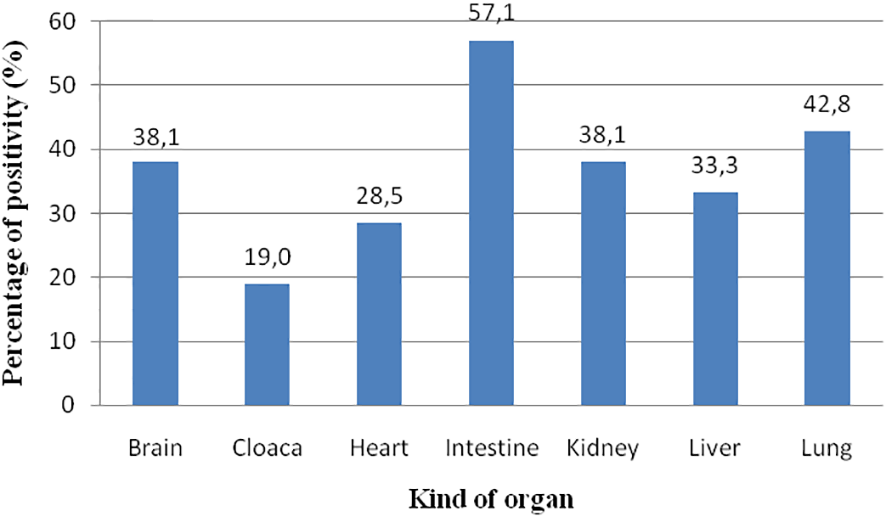 Prevalence of ChHV5 in the different organs analysed. The spleen is not considered since only three samples were analysed.