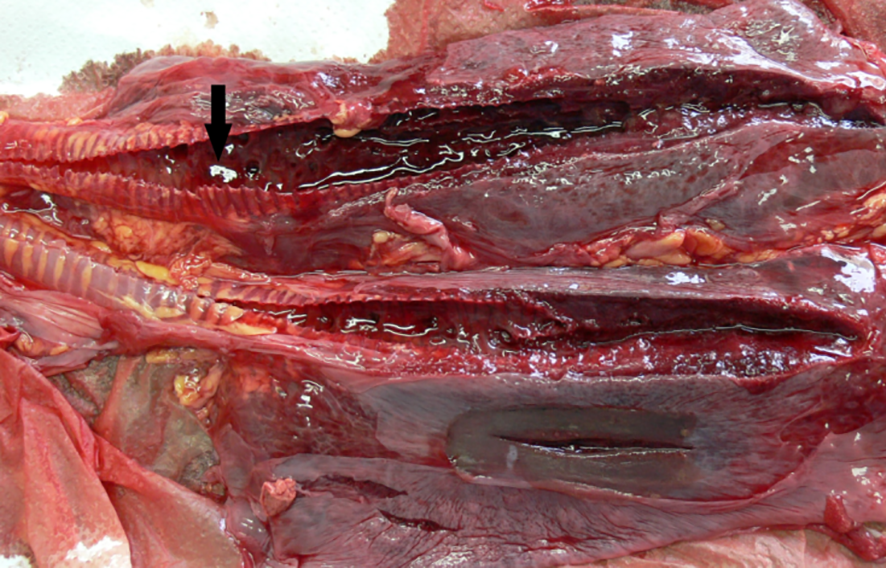 ChHV5-positive lungs with bilateral severe haemorrhagic congestion in the airways and in the parenchyma. Arrow indicates blood clots in the lumen of the airways.