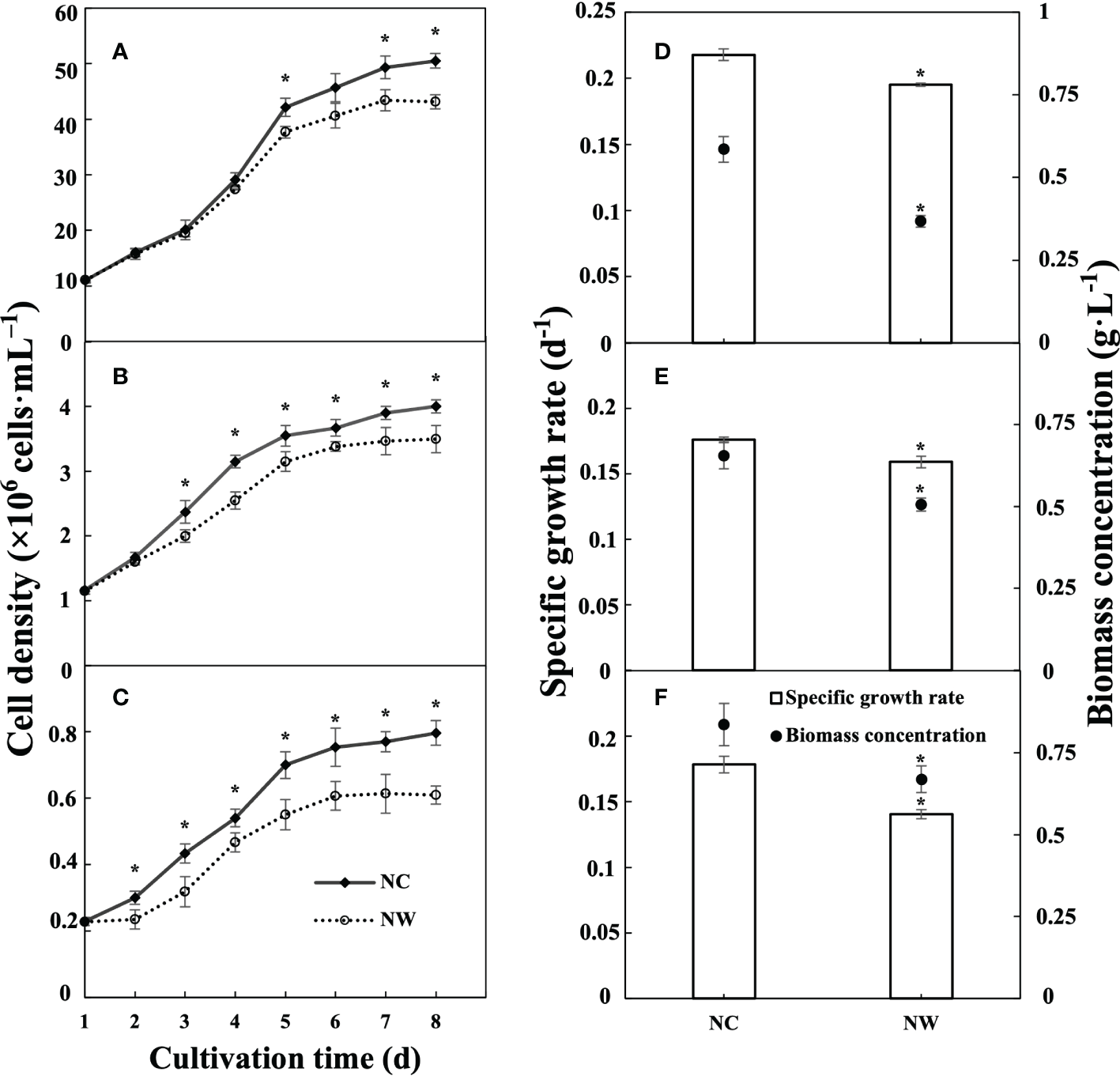 Growth performances of N. oceanica(A, D), C. atomus(B, E), and C. weissflogii(C, F). NC, nitrate-N concentration of 13.85 mg·L–1. NW, nitrate-N concentration of 5 mg·L–1. The one-way ANOVA analysis and the Tukey’s post hoc test were executed to estimate the differences. “*” indicates a significant difference (P< 0.05) between NC and NW at the same time point. Data are displayed as the mean ± SD (standard deviation) (n = 3).