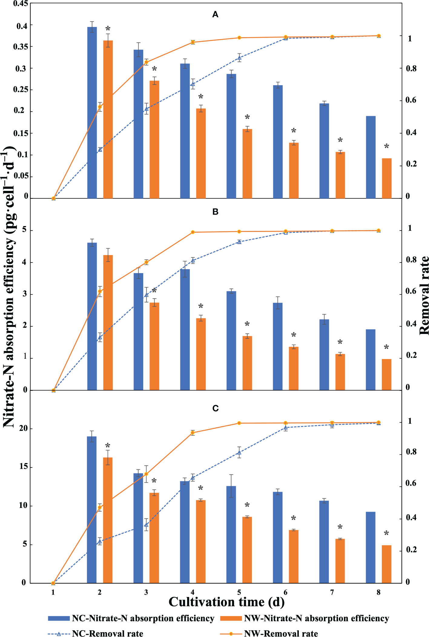 Nitrate-N absorption efficiency and nitrate-N removal rate of N. oceanica(A), C. atomus(B), and C. weissflogii(C). NC, nitrate-N concentration of 13.85 mg·L–1. NW, nitrate-N concentration of 5 mg·L–1. The one-way ANOVA analysis and the Tukey’s post hoc test were executed to estimate the differences. “*” above the column indicates a significant difference (P< 0.05) between NC and NW at the same timepoint. Data are displayed as the mean ± SD (standard deviation) (n = 3).