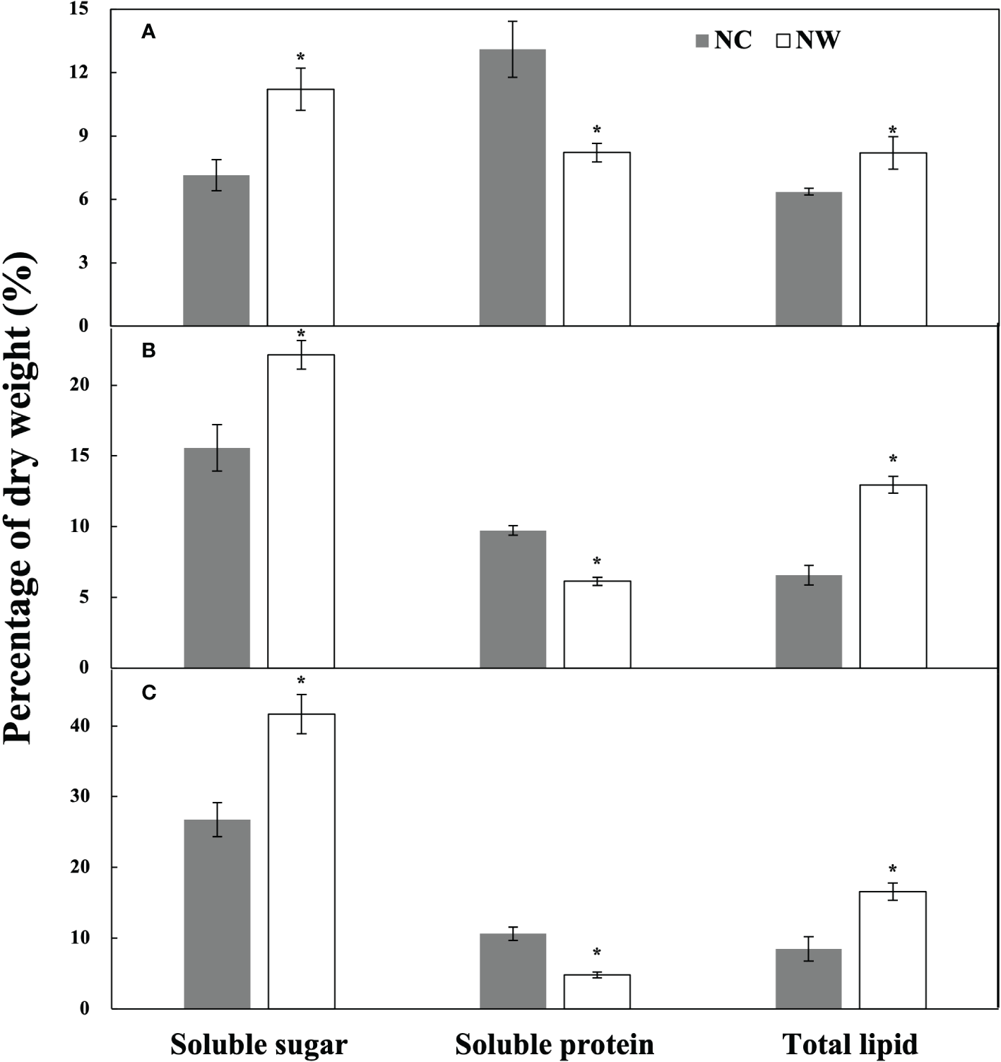 Contents of soluble sugar, soluble protein, and total lipid of N. oceanica(A), C. atomus(B), and C. weissflogii(C). NC, nitrate-N concentration of 13.85 mg·L–1. NW, nitrate-N concentration of 5 mg·L–1. The one-way ANOVA analysis and the Tukey’s post hoc test were executed to estimate the differences. “*” above the column indicates a significant difference (P< 0.05) between NC and NW. Data are displayed as the mean ± SD (standard deviation) (n = 3).