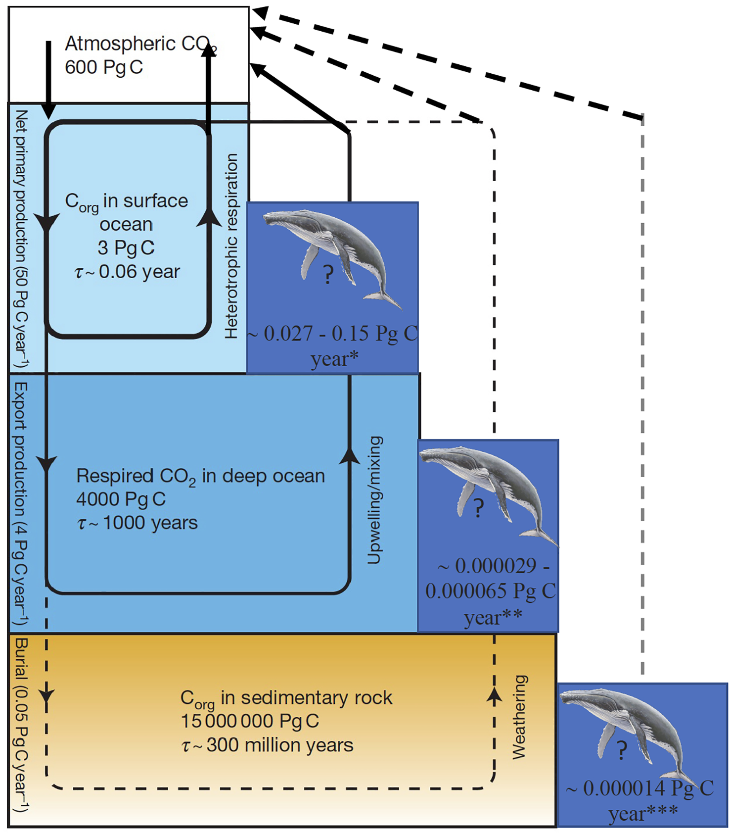 Whales amongst other marine life contribute to the biological carbon pump providing a secondary transfer pathway (Bowen, 1997; Mariani et al., 2020; National Academies of Sciences and Medicine, 2022). The biological carbon pump involves a number of processes through which inorganic carbon such as CO2 is fixed into organic matter via photosynthesis and then transported into deeper ocean away from the atmosphere (Claustre et al., 2021). Whales mediate transfer of carbon from inorganic to organic forms through marine biota activity and its export into the deeper ocean. Carbon export may eventually add to the carbon pool of the global ocean circulation or sequestration into marine sediments, which implies much longer recycling time scales (millennia) of inorganic carbon back to the atmosphere (Strand and Benford, 2009; Legge et al., 2020). Marine organic carbon travels through nested cycles operating on temporal scales of orders of magnitude difference and are subsystems of the global ocean carbon cycle (Figure 1).