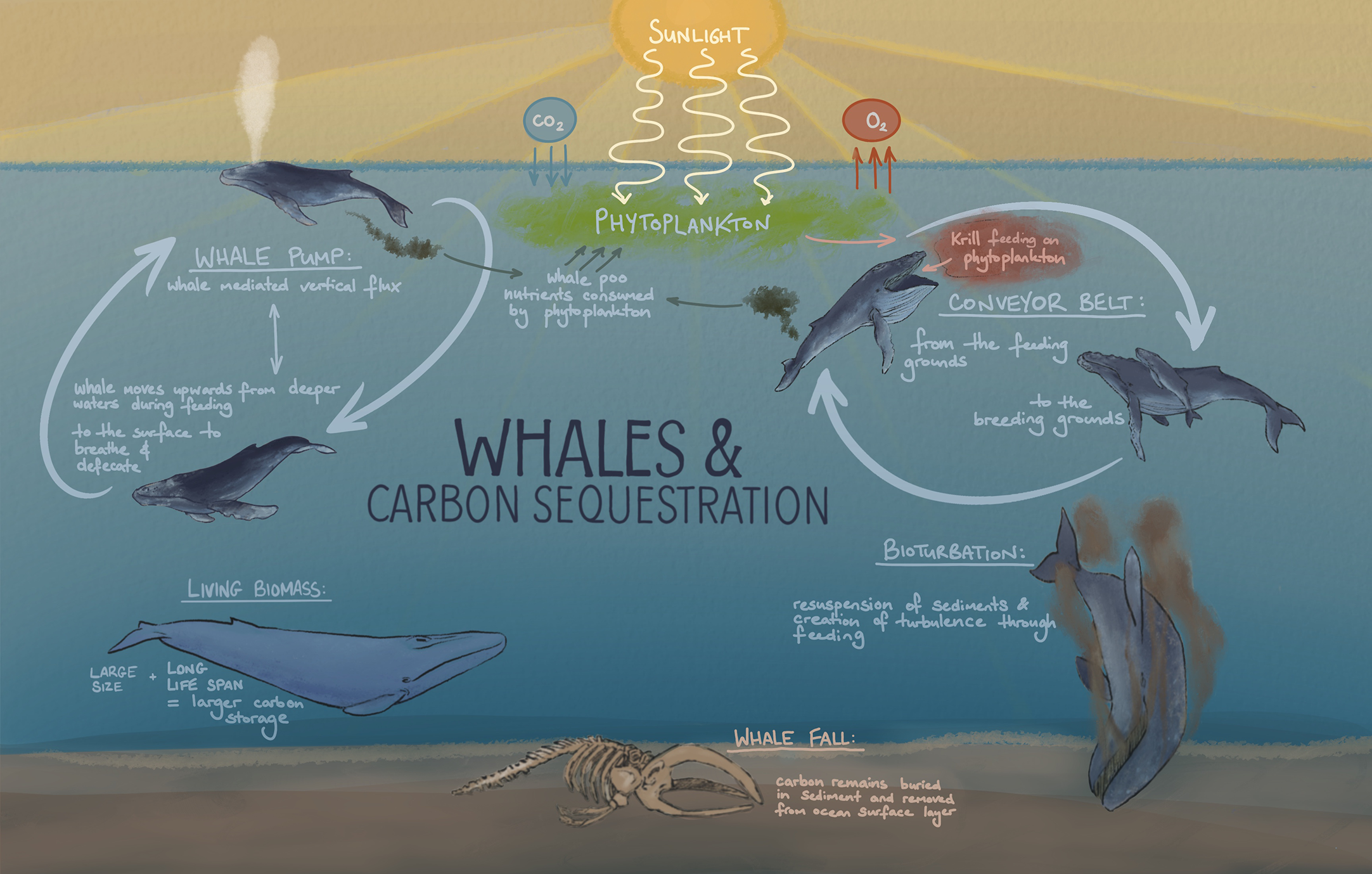 Illustration of five different ways in which whales can contribute to an increase in oceanic removal of atmospheric carbon: whale pump, whale conveyor belt, whale biomass and known long life span, whale falls, and whale bioturbation (artist impression based on Roman et al., 2014).