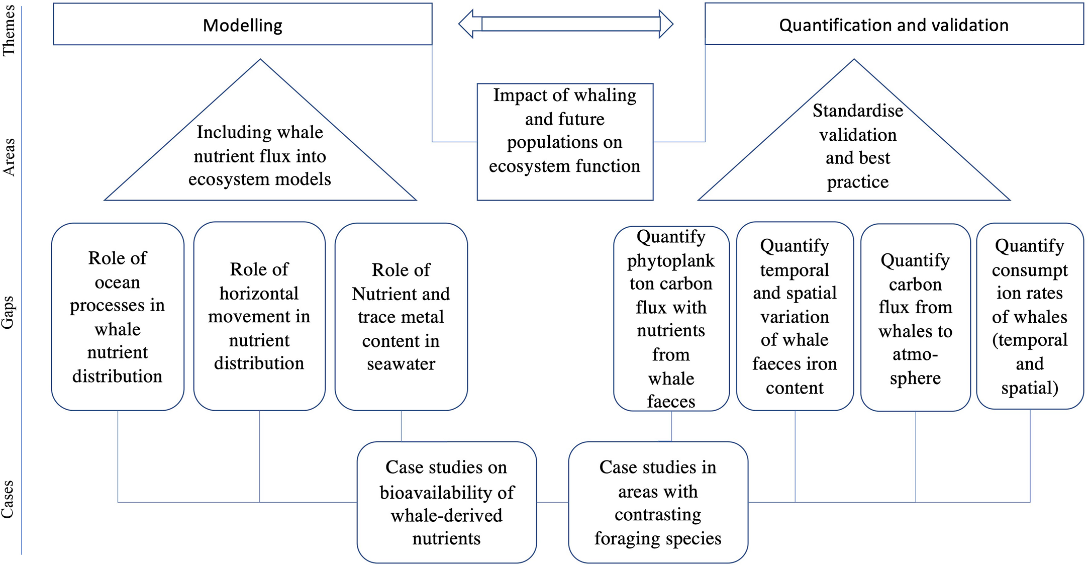 Derived from the above discussion, we identified 12 fundamental research areas related to the contribution of whales to atmospheric carbon sink (Figure 4). An overarching topic that applies to all these research fields is the impact of whaling on ecosystem function and future population growth or decline. These areas fall under the overarching themes of modelling, quantification and validation. Future ecosystem models require the inclusion of nutrient flux from whales. There are different aspects of whale nutrient flux that require further investigations including the role of whale mediated nutrient distribution in ocean processes, the role of horizontal movement in nutrient distribution, and the relevance of background nutrient and trace metal content in seawater.