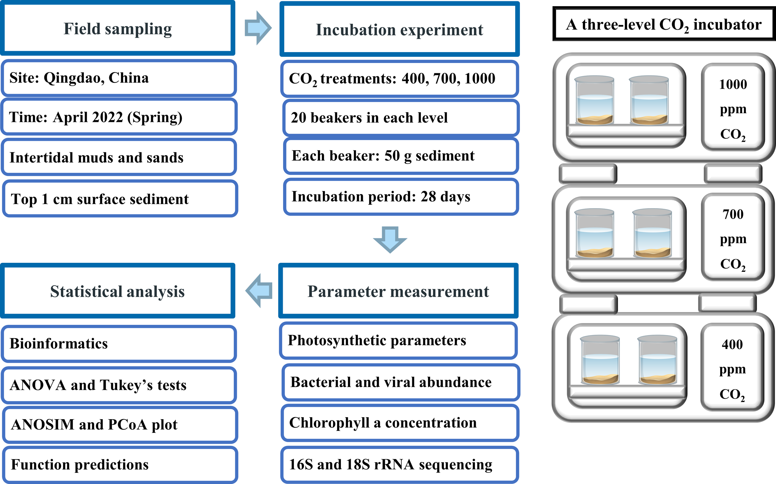 To fill in these research gaps, we undertook a 28-day CO2 enhancement experiment to investigate how OA affected the MPB biomass, community structure and functions of benthic biofilms in soft intertidal sediments. The MPB biomass was estimated by chlorophyll a concentration. The biofilm community structure was analysed by 16S rRNA and 18S rRNA sequencing, focusing on α-diversity, community composition and network structure. The FAPROTAX (Functional Annotation of Prokaryotic Taxa) database was used to predict ecologically relevant functions (e.g., biogeochemical cycles) of prokaryotes in biofilms (Louca et al., 2016). It is hypothesized that OA would increase the MPB biomass (microalgal biomass), bacterial abundance and viral abundance in soft intertidal sediments. The increased MPB biomass would probably be attributable to DIC (dissolved inorganic carbon) addition that can enhance the photosynthesis of microalgae (Marques da Silva et al., 2017). The increased bacterial abundance may result from the enhanced MPB biomass because the algal exudates are the primary food sources for bacteria (Haynes et al., 2007). The increased viral abundance will probably result from the elevated bacterial abundance. It is also hypothesized that OA will alter the MPB and bacterial community composition in sediments because of the species-specific responses to OA (Vargas et al., 2017). It is also hypothesized that OA will alter the ecologically relevant functions (e.g., nutrient cycling) of benthic biofilms because of the changed bacterial community composition.