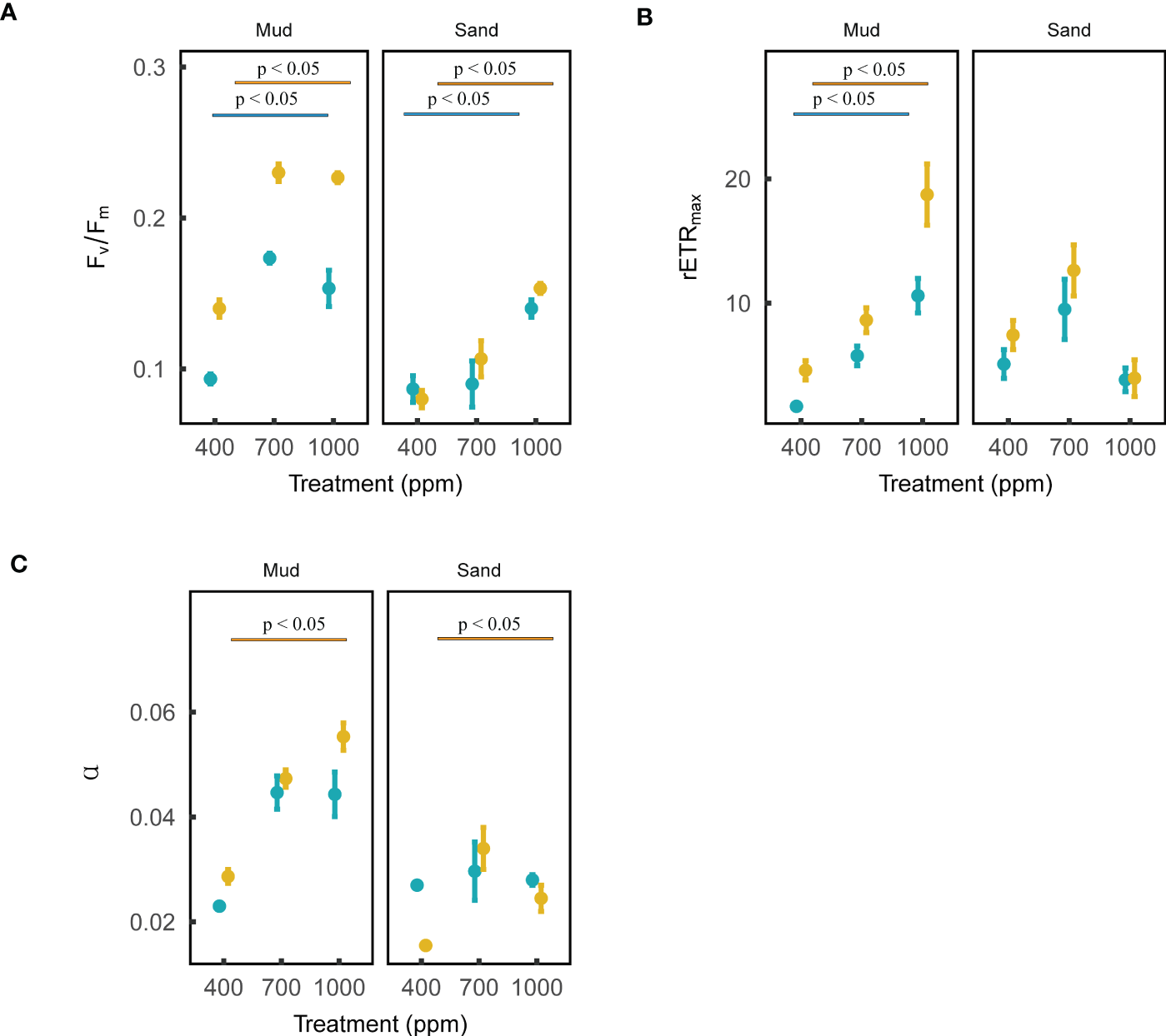 The maximum quantum yield (Fv/Fm) of both MPB cyanobacteria and diatoms in both muds and sands was positively affected by OA (ANOVA, muds: Pdiatoms < 0.001, Pcyanobacteria < 0.001; sands: Pdiatoms < 0.01, Pcyanobacteria < 0.05; Figure 3). The photosynthetic efficiency (α) of cyanobacteria in both muds and sands was not affected by OA, while that of diatoms was positively affected by OA (ANOVA, cyanobacteria: Pmud = 0.090, Psand = 0.949; diatoms: Pmud < 0.001, Psand < 0.05; Figure 3). The maximum relative electron transport rate (rETRmax) of both MPB cyanobacteria and diatoms in muds was positively influenced by 1000 ppm CO2 enhancement, while the rETRmax values for sands were not affected by OA (ANOVA, muds: Pdiatoms < 0.01, Pcyanobacteria < 0.01; sands: Pdiatoms = 0.346, Pcyanobacteria = 0.109; Figure 3).