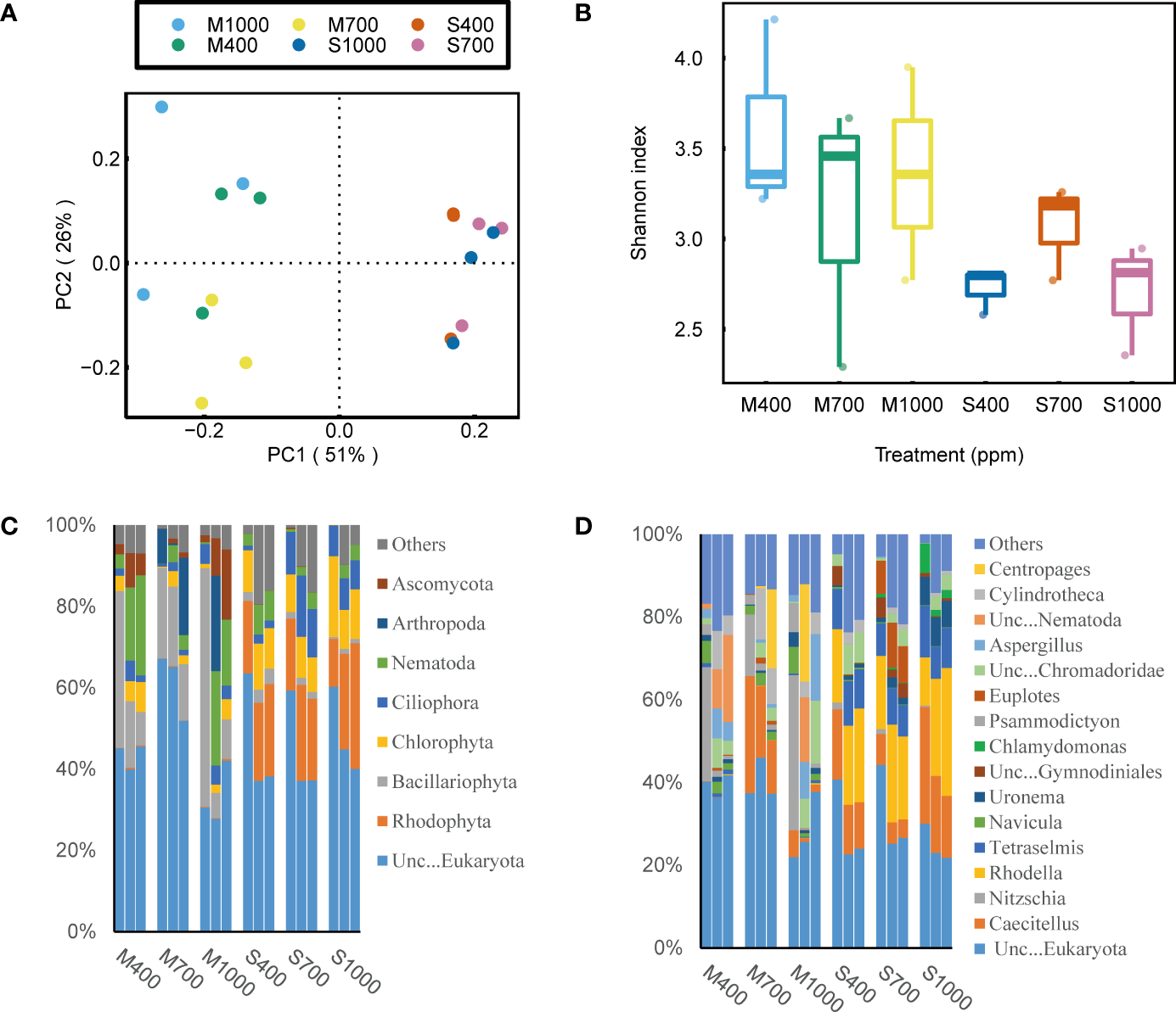 Effects of ocean acidification on the eukaryotic community in muddy and sandy intertidal sediments. Statistically significant differences were analysed by a ANOSIM test (plot A), ANOVA tests and post hoc Tukey’s tests (plot B, C and D). (A) Principal Coordinate Analysis (PCoA) of eukaryotic community composition, generated in R software using Bray–Curtis distance on phylum level. (B) Alpha diversity of eukaryotic community, calculated in Mothur software using OTU data and Shannon index. (C) Relative abundance of eukaryotic taxa at phylum level, generated in Uparse software based on Silva reference database. (D) Relative abundance of eukaryotic taxa at genus level.
