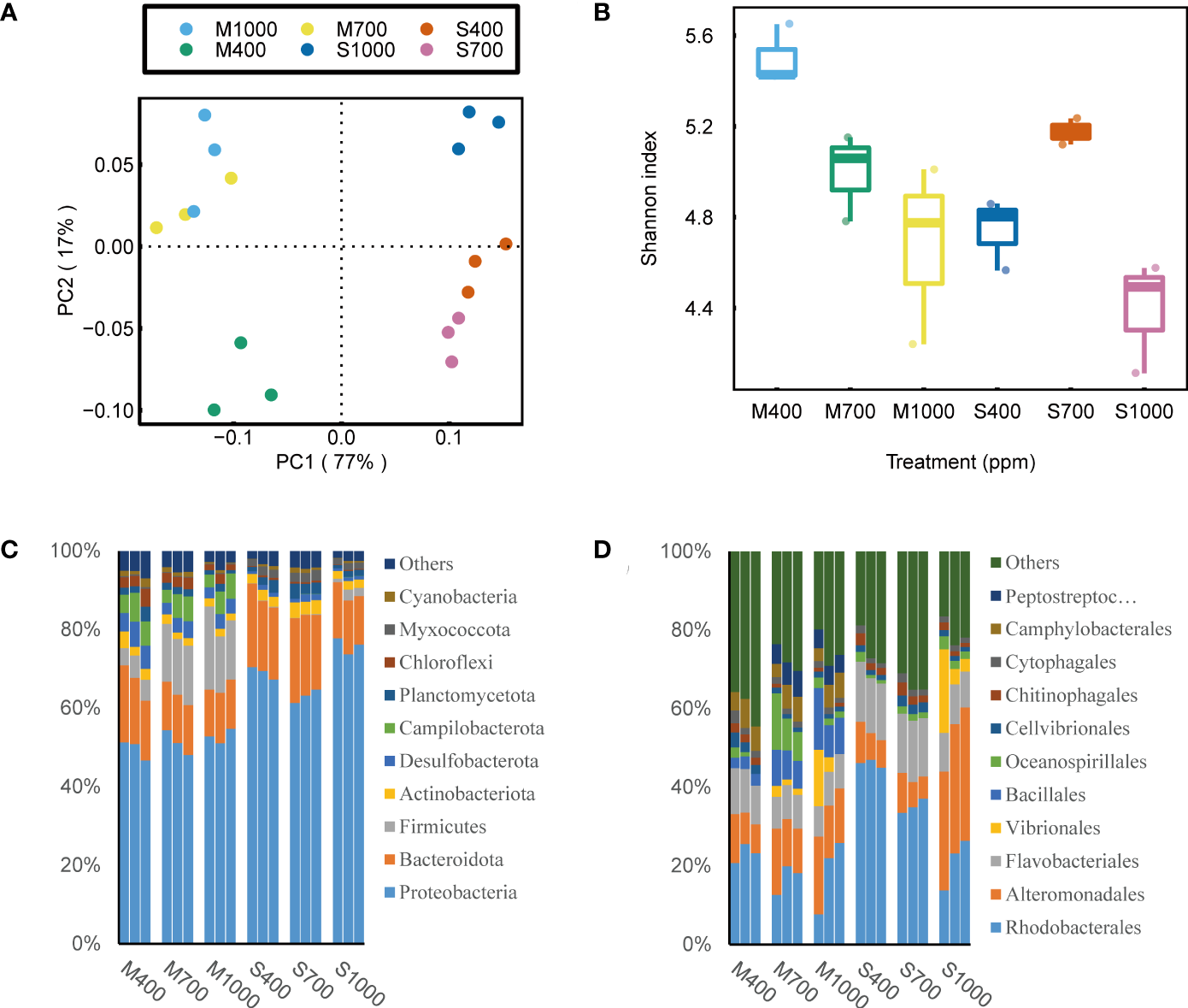 The effect of OA on the relative abundance of bacterial taxa in intertidal biofilms has been studied previously but the results have been quite variable. This study showed that for bacterial community in muds, OA decreased the relative abundance of Bacteroidota but increased that of Firmicutes; while in sands, OA decreased the relative abundance of Bacteroidota but increased that of Proteobacteria. However, Taylor et al. (2014) observed that within biofilms on intertidal rocks, the relative abundance of phylum Bacteroidota, the class Gammaproteobacteria and Alphaproteobacteria increased while the order Flavobacteriales decreased as CO2 levels increased. Kerfahi et al. (2020) reported that within biofilms on intertidal rocks, the relative abundance of phylum Bacteroidota, the order Alteromonadales decreased while Rhodobacterales remained unchanged as CO2 levels increased. Overall, it is difficult to determine which bacterial taxa in benthic biofilm will benefit from OA and these divergent results can probably be attributed to the use of different substrate (i.e., soft sediments vs. rocks) or different experimental conditions (i.e., aquarium-based experiment vs. natural CO2 vents).