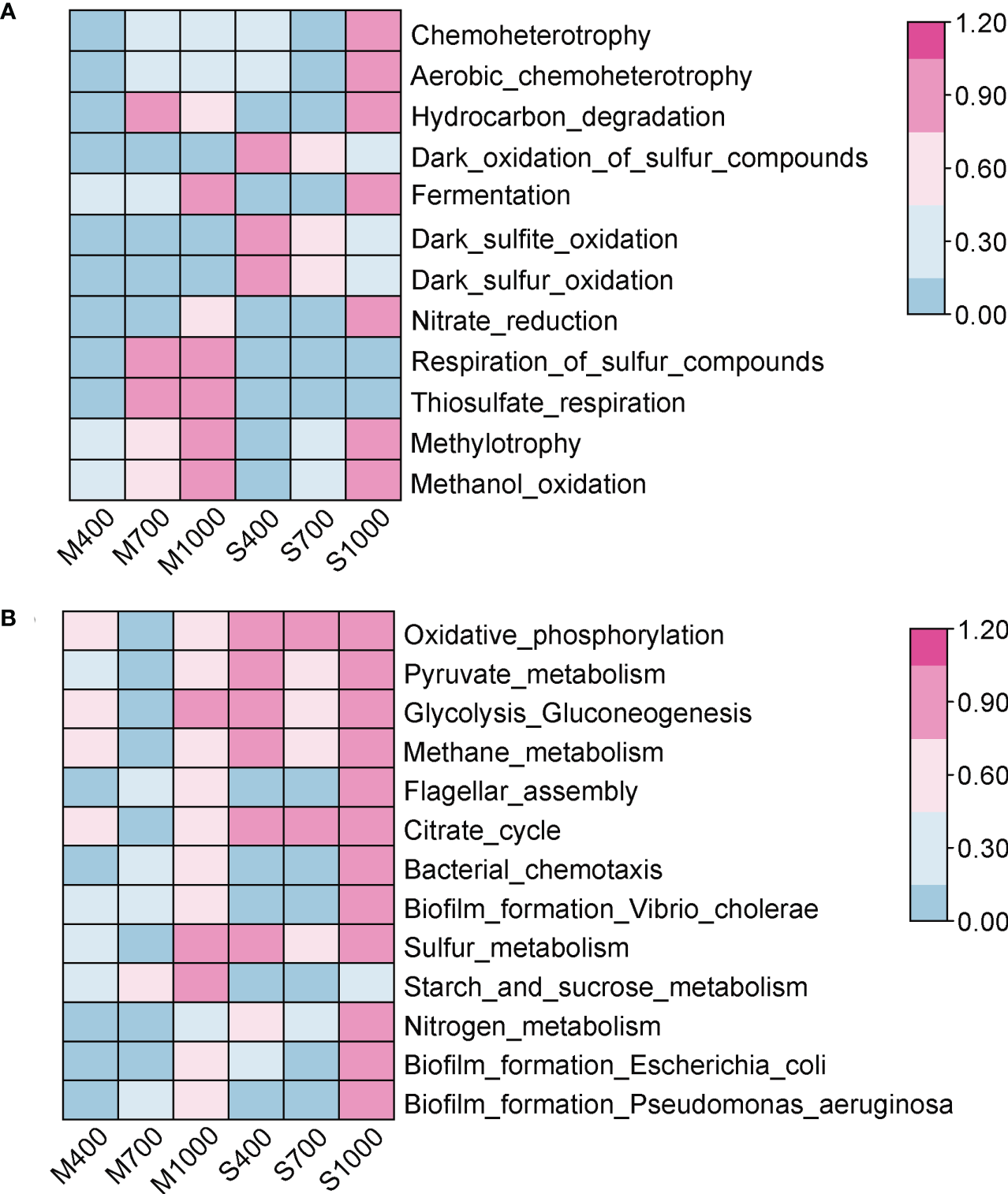 Effects of ocean acidification on the function abundance of prokaryotic community in muddy and sandy intertidal sediments. Statistically significant differences were analysed by ANOVA tests and post hoc Tukey’s tests. Abundance data were standardized to 0 - 1, and heatmaps were generated by TBtool software. (A) The ecologically relevant functions of prokaryotic community, predicted by FAPROTAX. (B) The biological pathways of prokaryotic community, predicted by PICRUSt2 based on KEGG database.