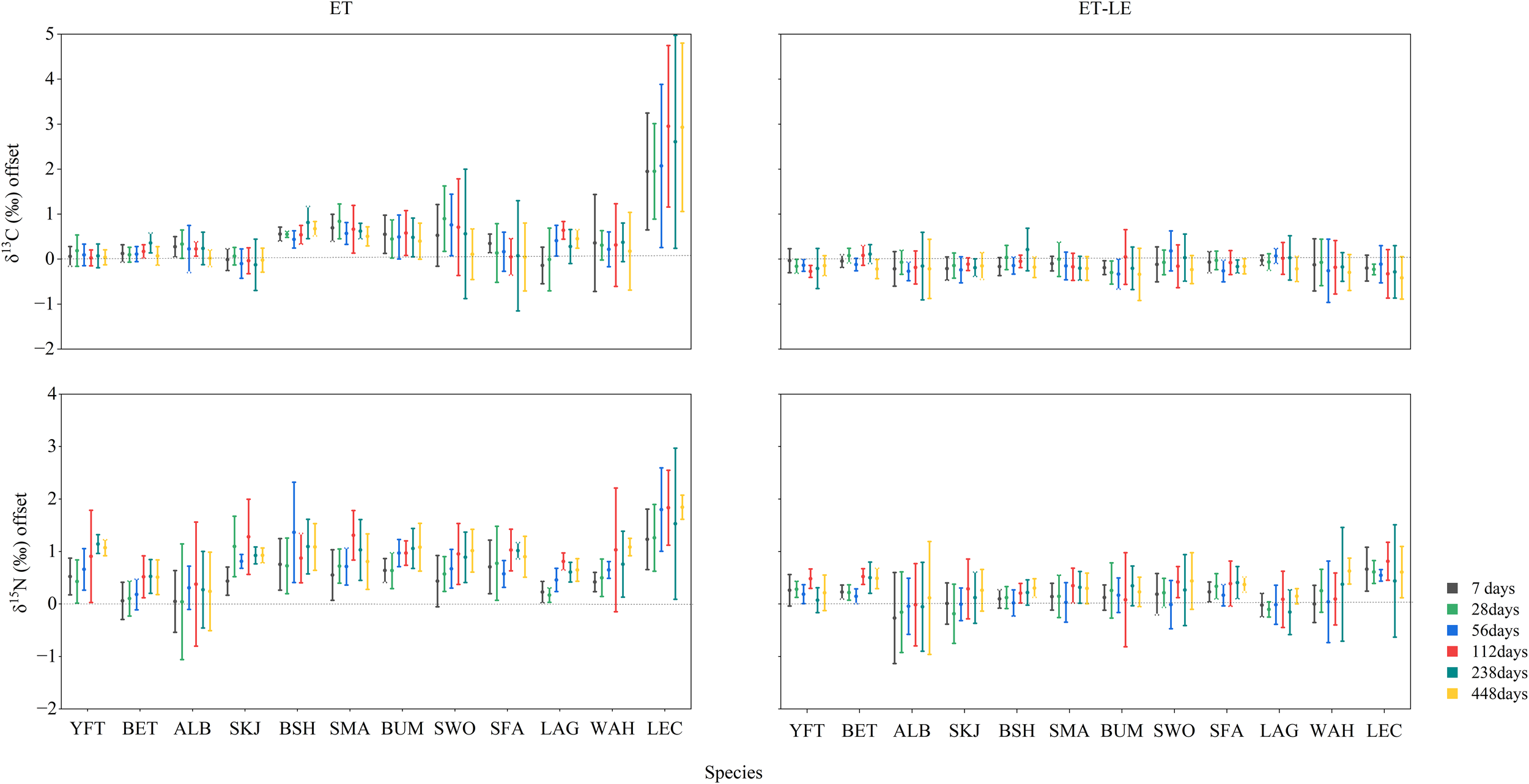The δ13C and δ15N offsets for all treatments (ET, ET+LE) in muscle tissue across each species.
