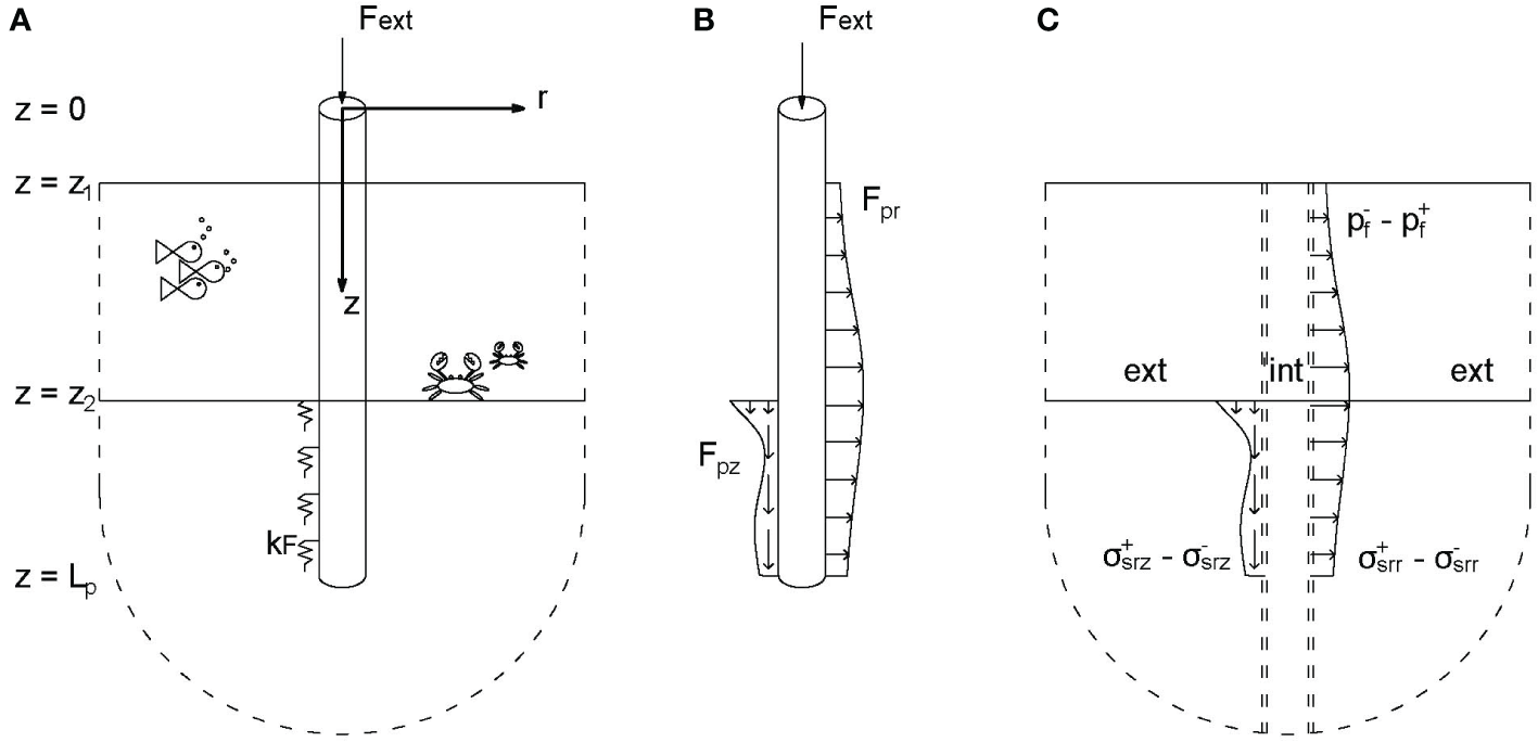 The fluid equation of motion is written as a function of the displacement potential ϕf (r, z), with and fluid pressure , including as volume injection source at the location of the pile (Jensen et al., 2011). The soil equation of motion contains displacements vector and body forces vector at the radius of the pile. The boundary value problem for the fluid-soil substructure is composed of a single fluid layer overlaying a soil half-space. The accompanying interface conditions read:
