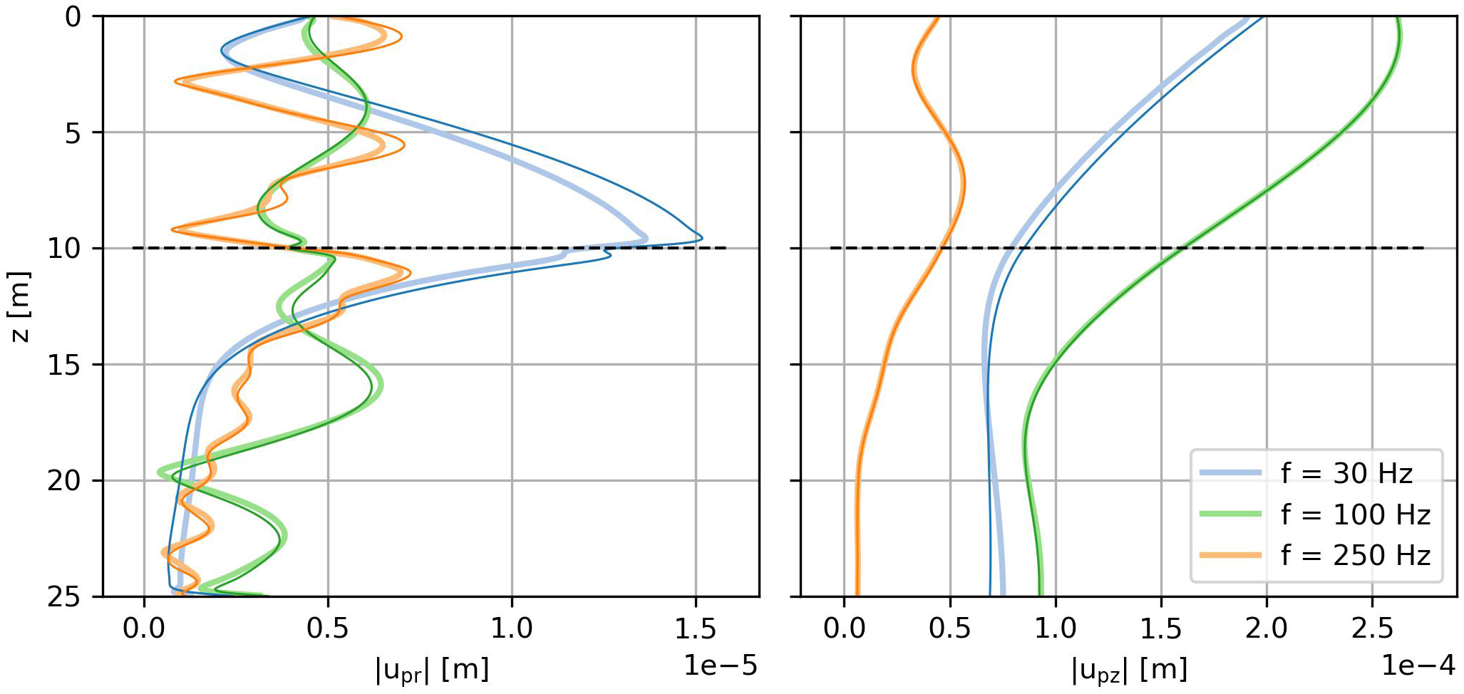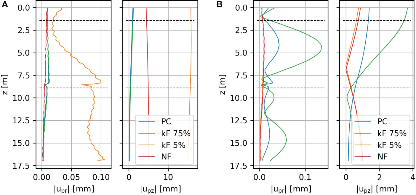 The amplitudes of the pile displacements in radial (upr) and vertical (upz) direction for a 1 MN harmonic force on top of the pile at 25 Hz and 125 Hz in (A, B), respectively.