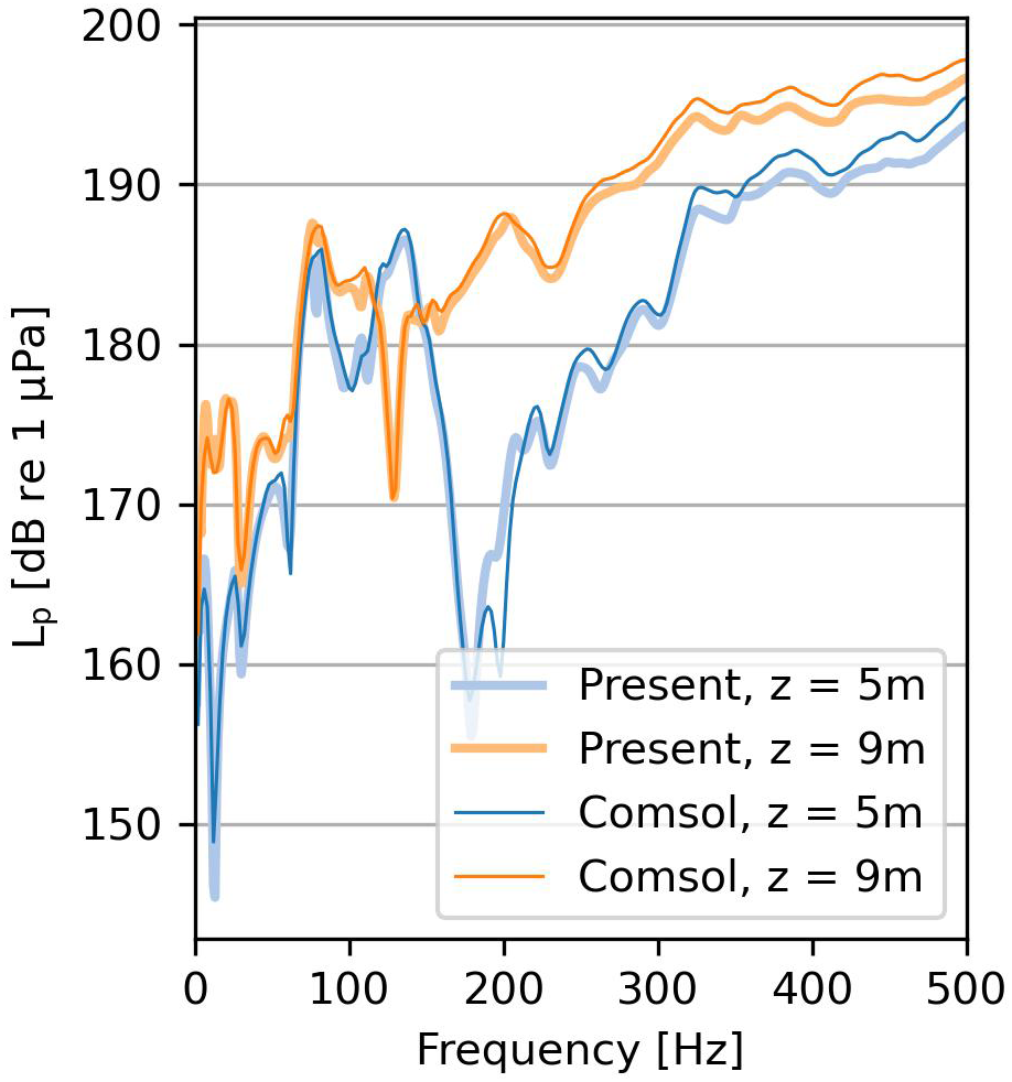 in which the real mean square in the frequency domain is found by and the reference pressure in underwater acoustics is pref = 1µPa. The sound pressure levels in the near field are in excellent agreement between Comsol and the present model, both in the center of the fluid layer (z = 5 m) and at one meter above the seabed surface (z = 9 m) as shown in Figure 3.