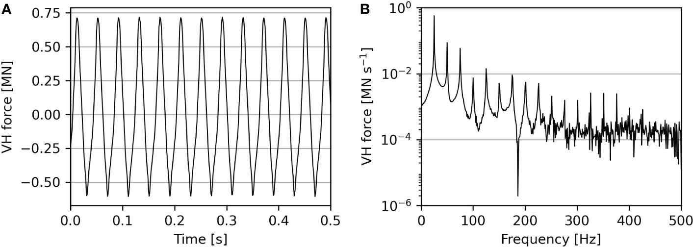 Estimated vibratory force exerted by the installation tool at the pile head as a function. (A) shows the time signature and (B) the amplitude spectrum of the force (Tsetas et al., 2023a).