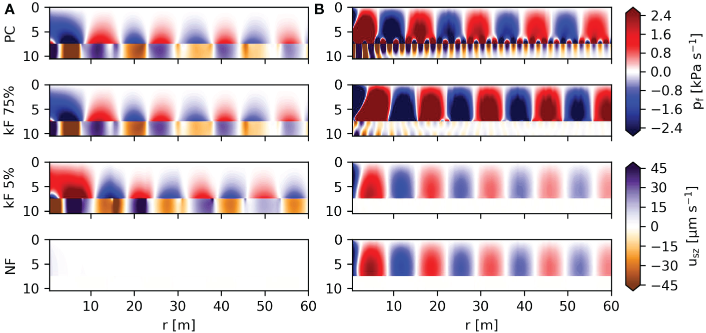 Allowing for relative motion between pile and soil affects the pile vibrations and the energy transferred to the surrounding domain. Figure 5 shows the amplitude of the pile displacements at 25 Hz and 125 Hz for varying values of . The frequencies are chosen specifically at the driving frequency and the fourth super-harmonic. Figure 5A shows that the rigid body motion governs the pile vibrations at low frequencies. For kF 5%, the radial pile and soil displacements are amplified. This is counterintuitive, but because the system has reduced soil stiffness and low damping, the resonance amplitude of the rigid body mode is amplified significantly. At higher frequencies, the dynamic response of the pile is strongly influenced by the pile-soil interface as shown in Figure 5B; altering the noise source significantly in the fluid domain.