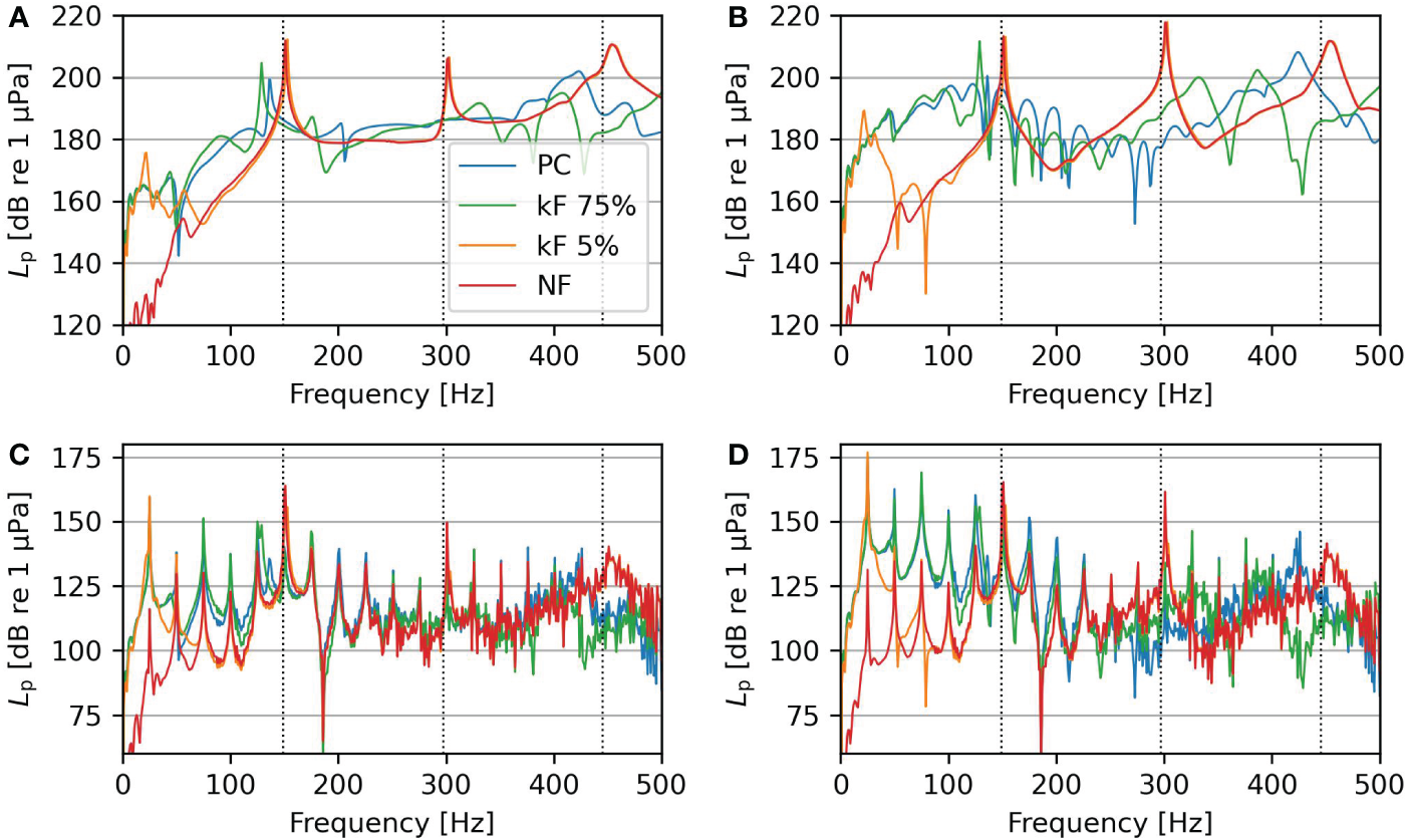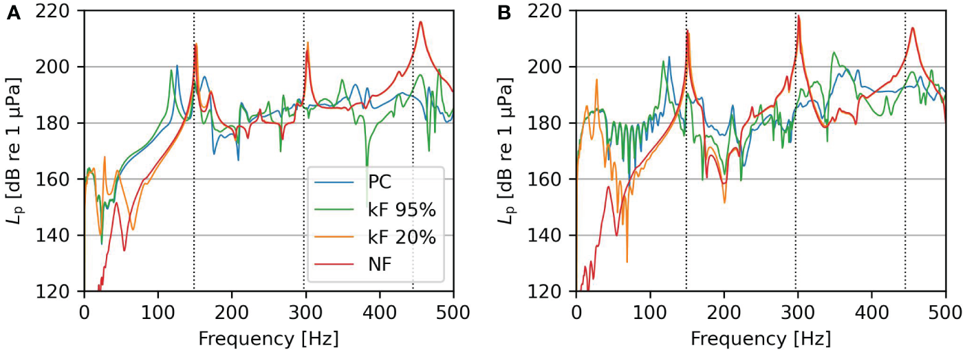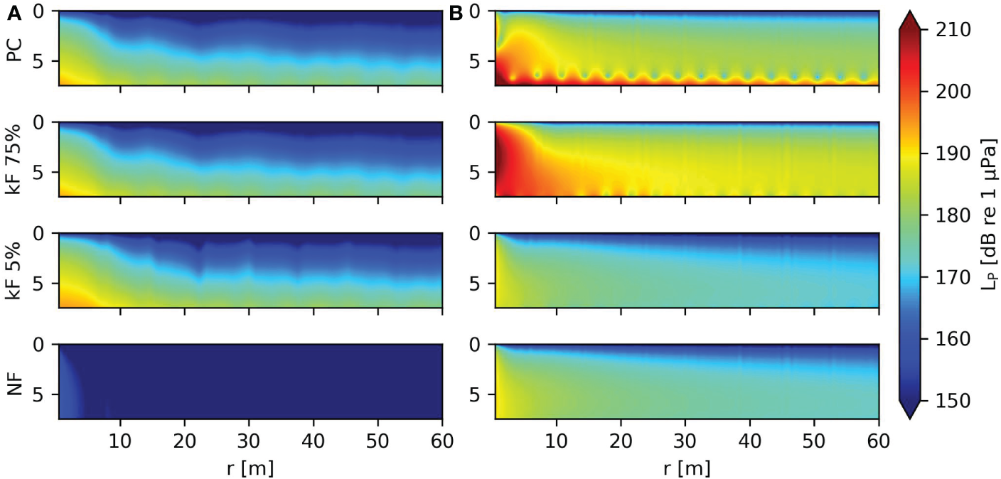 The change in pile dynamics affects the soil displacements and pressure levels in the fluid. The traveling waves in fluid and soil are visualized in Figure 6. The figure shows snapshots of the fluid pressure and vertical soil displacement in the surroundings. Figure 6A shows that the Scholte waves govern the wavefield because the excitation frequency is below the cut-off frequency of this shallow fluid waveguide (fcut-off ≈ 37.5 Hz). The cut-off frequency linearly depends on water depth; thus, a pressure wave can exist at the driving frequency in the case of deeper waters. The Scholte wave is visible in the soil and fluid, though the amplitude is negligible in case of perfect sliding conditions (NF case). The soil motion is amplified at kF 5% because the main driving frequency is close to the eigenfrequency of the rigid body mode. It is debatable if this resonance is an artifact or physical. Experimental data should justify if it is indeed physical or that the artifact disappears with more realistic interface modeling, e.g. including damping. Contrary, Figure 6B clearly shows bulk pressure waves propagating through the fluid, while the Scholte waves influence a narrow zone close to the seabed. Next, the Scholte wave becomes visible with increasing pile-soil stiffness, though the penetration zone in the fluid reduces at higher frequencies due to the shorter wavelength of the Scholte waves. Figure 6 confirms the expectation that the interface conditions strongly affect both primary and secondary noise paths.