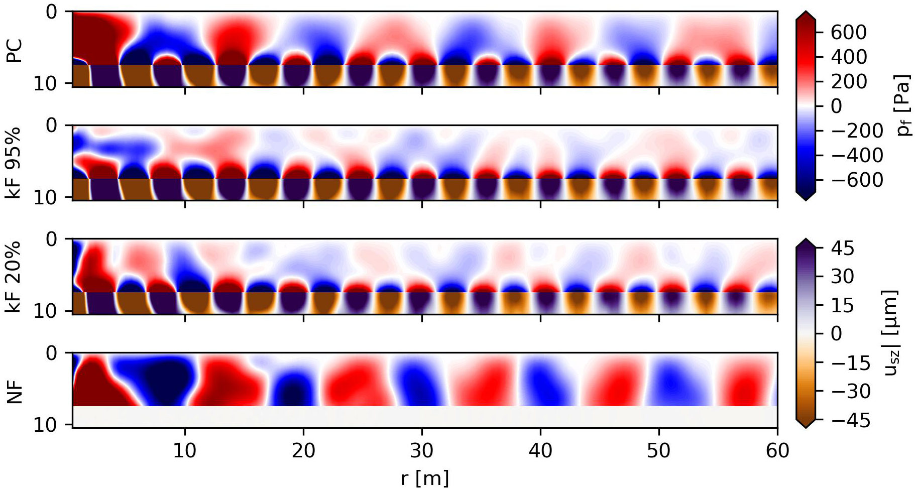 in which is the introduced contact stiffness element that allows for relative motion between pile and soil in the vertical direction. The limit cases of PC and NF are approached by the limits of and , respectively. In all cases, the continuity of displacements in the radial direction and equilibrium of stresses are satisfied.