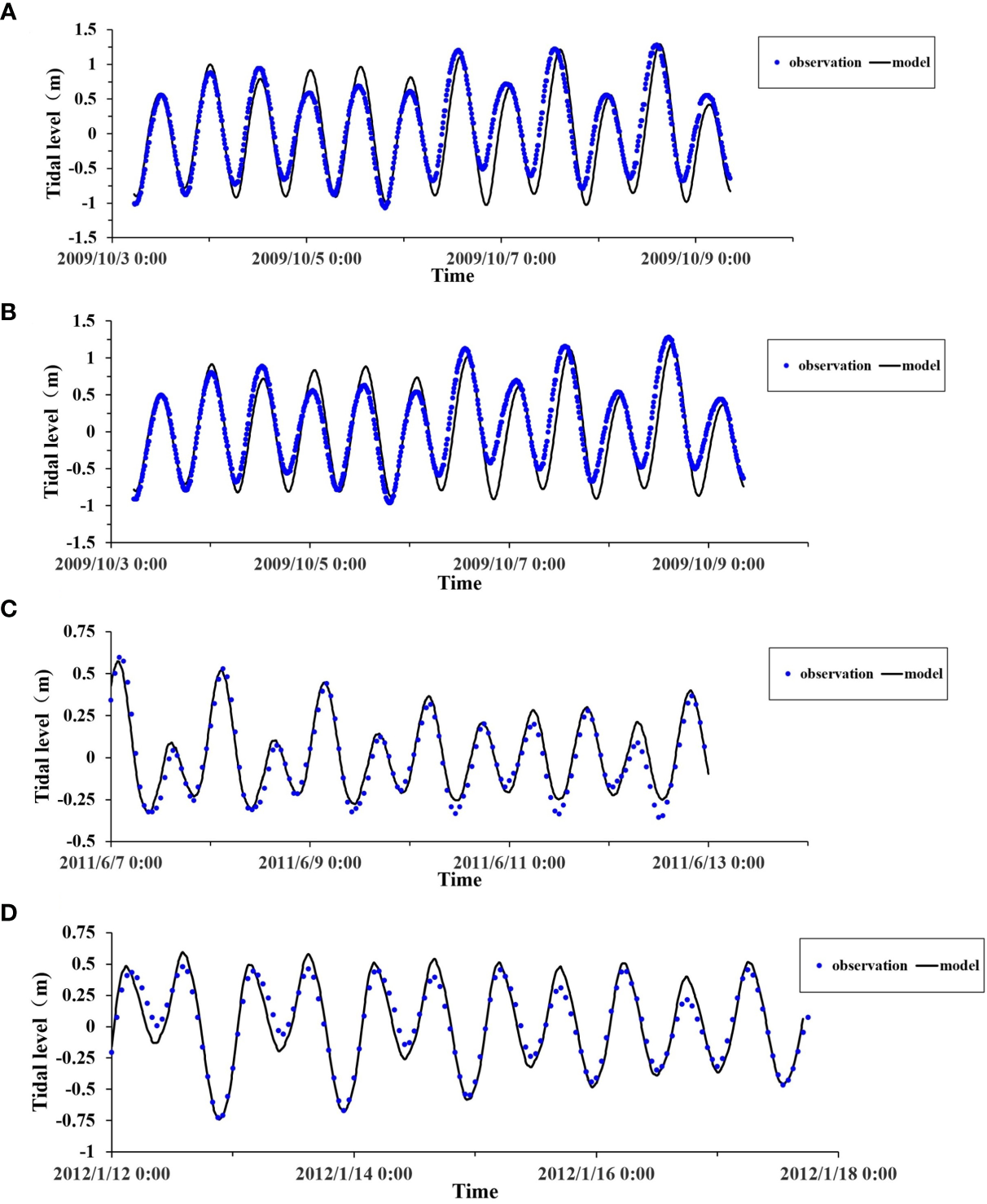 Tidal level comparison between model results and measured data at (A) Station P1, (B) Station P2, (C) Station P3, (D) Station P4.