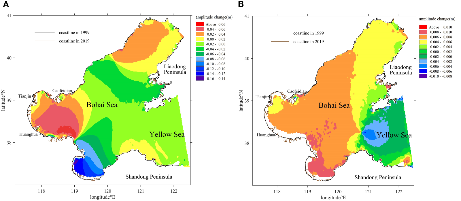 Tidal amplitude changes from 1999 to 2019 of (A) M2, (B) K1.