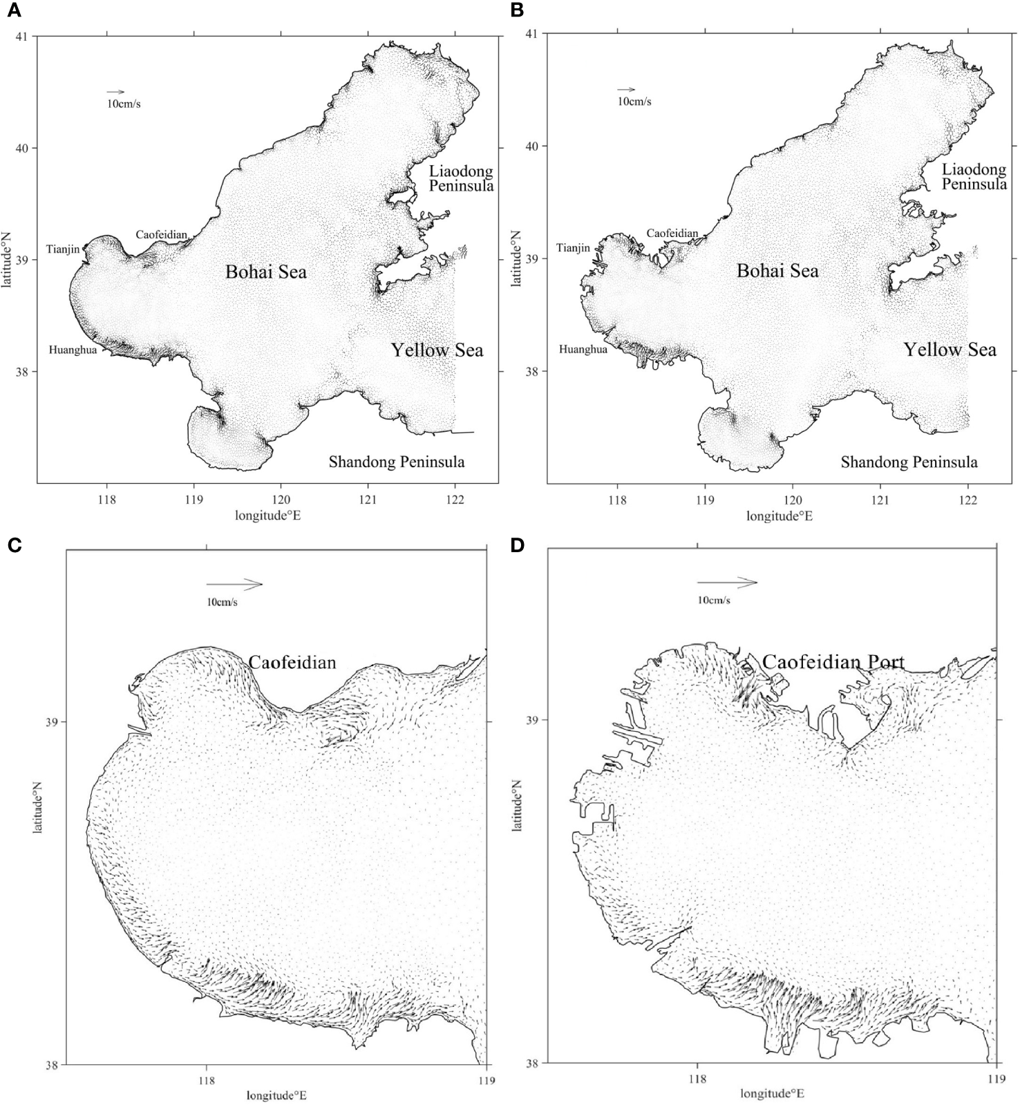 Simulated Eulerian tidal residual currents in (A) BHS in 1999; (B) BHS in 2019; (C) Bohai Bay in 1999; (D) Bohai Bay in 2019.