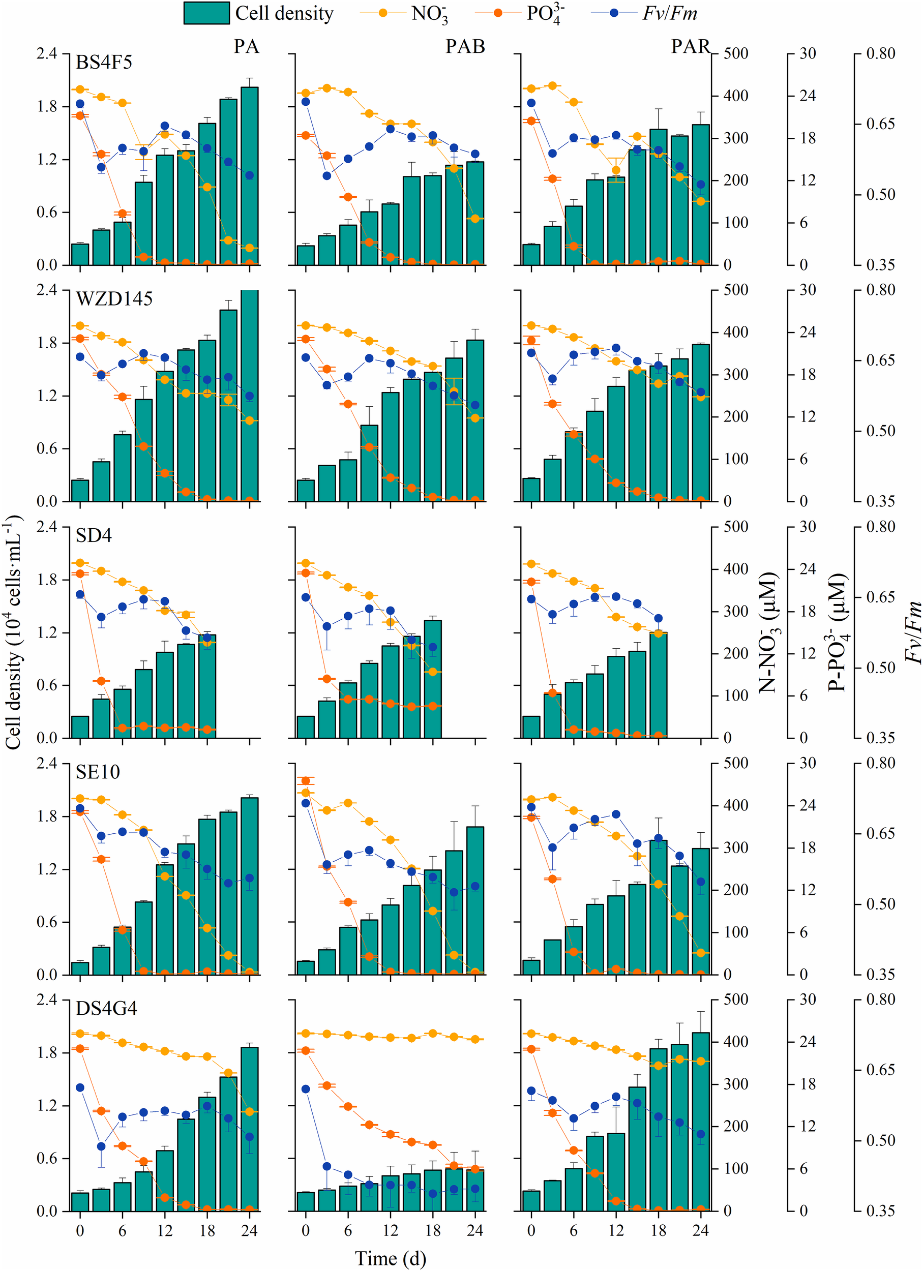 Regarding macronutrient levels during the culture, nitrogen was not depleted in the medium for any strains during the experiment, with the lowest concentration of 6.3 μmol mL-1 in strain SE10 under PAB on day 24 (Figure 1). Phosphate was depleted in the medium or was not consumed in strain SD4 under PA and PAB in the middle stage of culture (approximately on day 12). An exception was strain DS4G4 under PAB, which still had 5.9 μmol P mL-1 on day 24 (Figure 1). The time of phosphate depletion corresponded with the second decrease in Fv/Fm, reflecting photosynthetic activity. The first decrease of Fv/Fm occurred on day 3. Then, Fv/Fm started to recover in all cases except strain DS4G4 under PAR, which started on day 6, and it under PAB, which failed to recover (Figure 1).
