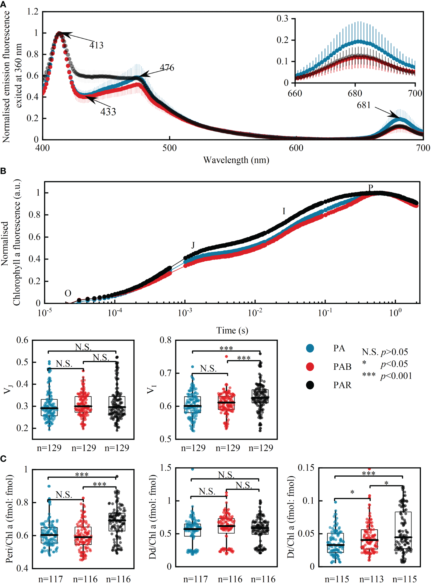 The effects of UVA on photosynthesis in P. lima complex and P. caipirignum. Mean fluorescence emission spectra exposed to PA, PAB, and PAR excited at 360 nm (UVA waveband), n=15 (A); OJIP curves and related parameters VJ and VI(B) obtained under different light treatments throughout the whole culture period. Ratios of peridinin (Peri), diadinoxanthin (Dd) and diatoxanthin (Dt) to chlorophyll a (Chl a) (C). Due to similar responses of Chl a fluorescence and pigment ratios to light treatments among five strains of P. lima complex and P. caipirignum (strain SE10), all five strains are pooled for light treatment analyses. N.S., non-significance, p > 0.05; *p < 0.05; ***p < 0.001.