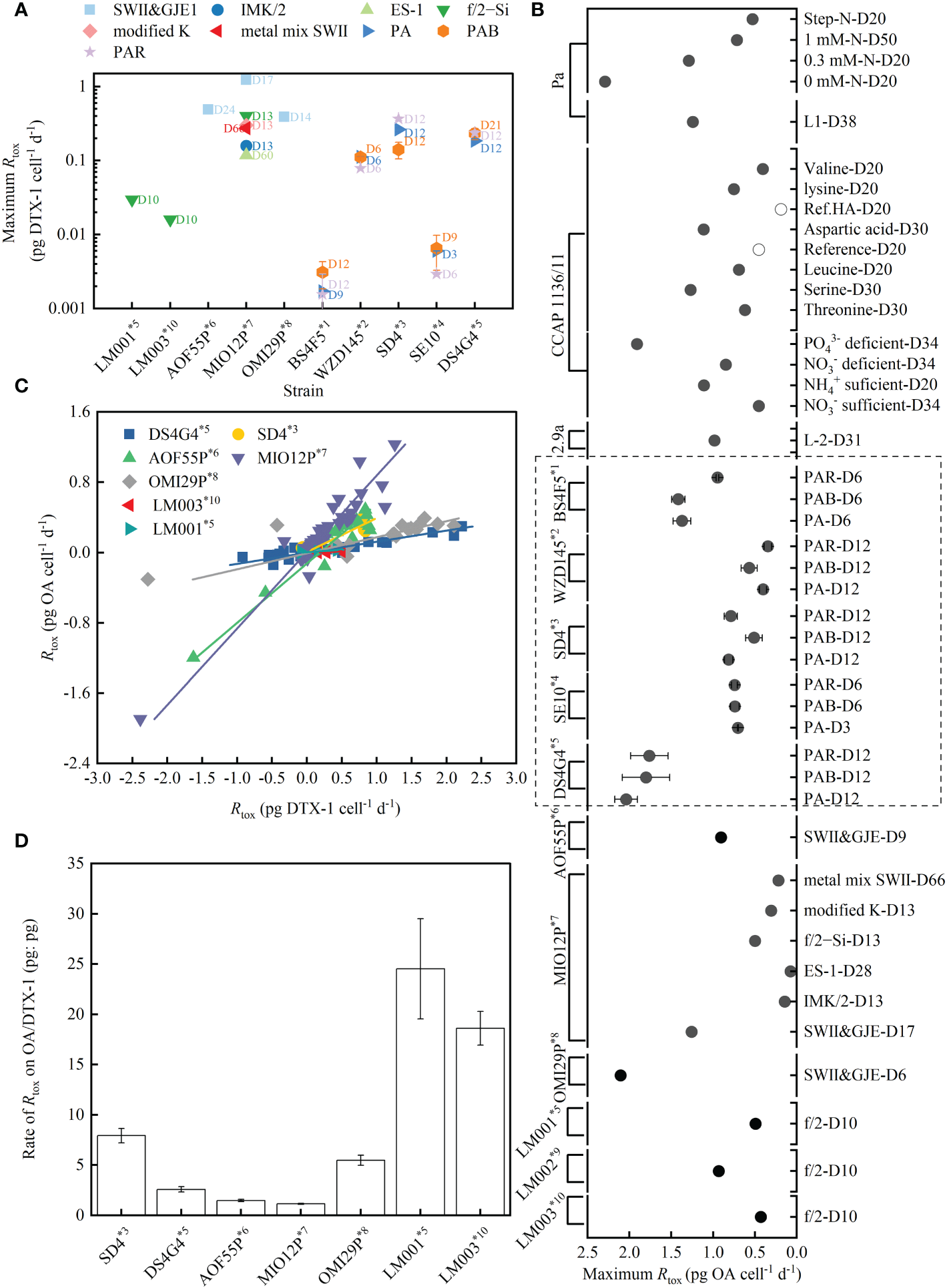Maximum toxin production rate (Rtox) of DTX-1 (A) and OA (B) under different treatments (the day is denoted by D) from various strains of the P. lima complex and P. caipirignum (strain SE10). Linear relationships between the Rtox of OA and DTX-1 in specific strains with a maximum DTX-1 production rate above 0.01 pg cell-1 d-1, except for strain WZD145 (C). The ratio of Rtox of OA/DTX-1 (pg: pg) varied with strains (D). Data for strain Pa from (McLachlan et al., 1994; Pan et al., 1999), strain CCAP 1136/11 (also known as strain PL2V) from (Souto et al., 2001; Varkitzi et al., 2010), strain 2.9a from (Nascimento et al., 2005), strains AOF55P, MIO12P and OMI12P from (Hashimoto et al., 2021), and strain LM001–003 from (Moreira-González et al., 2019) were recalculated to determine Rtox. The Rtox calculated in the current study are shown by the dashed rectangle (B). Strains were sorted into morphotypes according to large subunit (LSU) rDNA sequences: *1. Strain sorted into P. lima morphotype 1 by Zhang et al., 2015, proposed as P. lima complex clade 3 by Nishimura et al., 2020. *2. Strain sorted into P. lima morphotype 2 by Zhang et al., 2015. *3. Strain sorted into P. lima morphotype 3 by Zhang et al., 2015. and into P. lima complex subclade 1b by Nishimura et al., 2020. *4. Strain sorted into P. lima morphotype 4 by Zhang et al., 2015., regarded as P. caipirignum by Nascimento et al., 2017 and into P. caipirignum clade c by Nishimura et al., 2020. *5. Strain sorted into P. lima morphotype 5 by Zhang et al., 2015. and into P. cf. lima by Nishimura et al., 2020 and Moreira-González et al., 2019. *6. Strain sorted into P. lima complex subclade 1i by Nishimura et al., 2020. 7*. Strain sorted into P. lima complex subclade 1e by Nishimura et al., 2020. 8*. Strain sorted into P. lima complex subclade 1f by Nishimura et al., 2020. 9*. Strain sorted into P. lima complex clade B by Moreira-González et al., 2019. 10*. Strain sorted into P. lima complex clade C by Moreira-González et al., 2019.