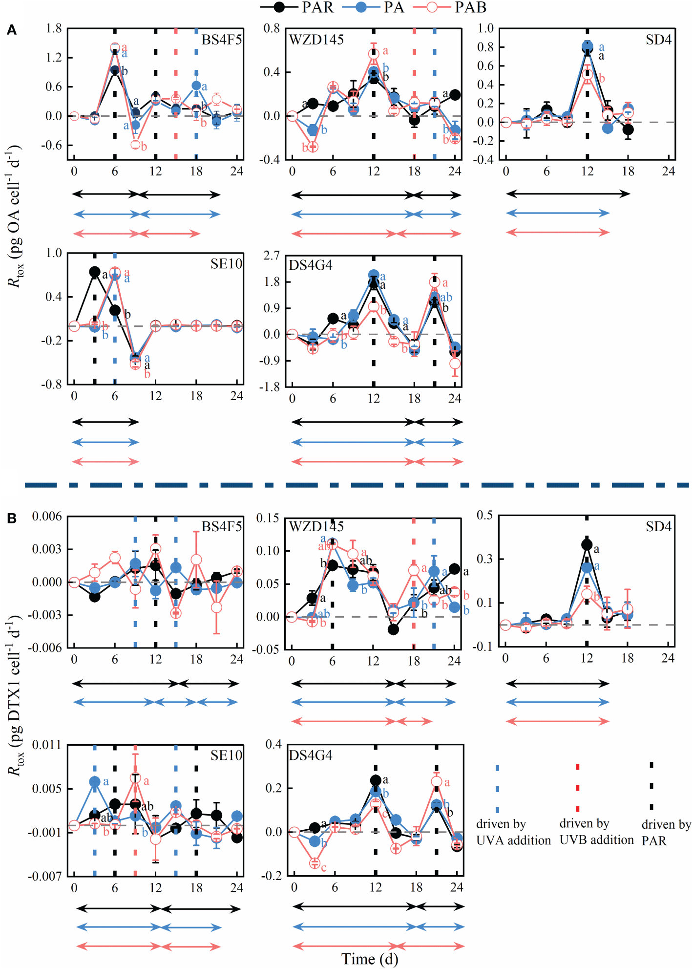 The trends in toxin production rate (Rtox) in (A) OA and (B) DTX-1 of the fivestrains of P. lima complex and P. caipirignum (strain SE10) over time under PAR, PA, and PAB treatments. LL, ML, and HL before the morphotypes represent their DTX-1 production capacities: 0.001-0.01, 0.01-0.1, and 0.1-1 pg cell-1 d-1, respectively. Regular peaks are shown in the time series. A complete ascent and descent process of Rtox is termed a period and highlighted using a two-way arrow. The colour of the arrows represented different light treatments. Statistically significant differences (p< 0.05) between the light treatments at the same time point are labelled using different letters, n=3.