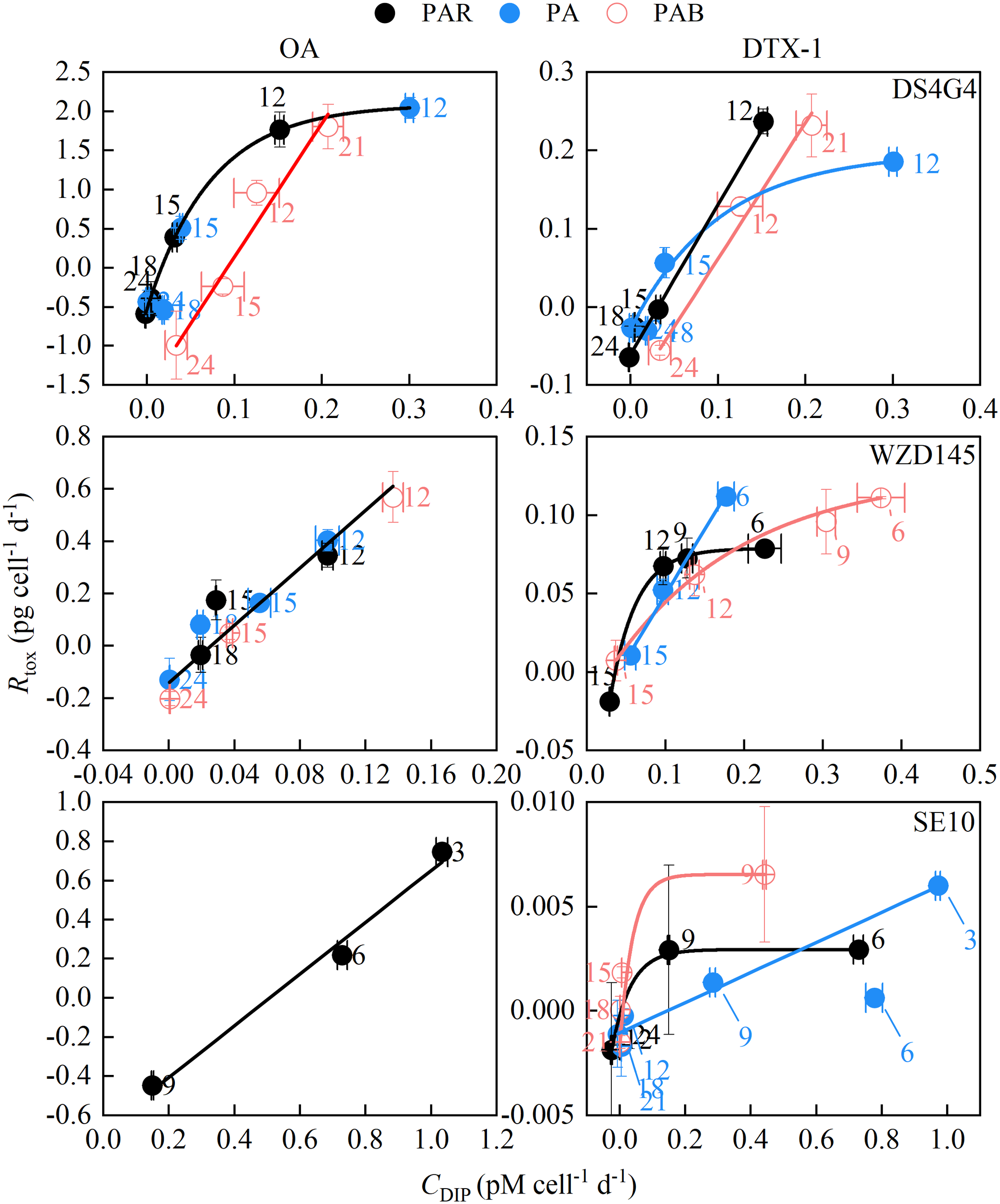 The low level (LL, 0.001-0.01 pg cell-1 d-1) of Rmax on DTX-1 includes strains BS4F5 and SE10, with Rmax for DTX-1 ranging from 0.0029-0.0065 pg cell-1 d-1 and 0.0015-0.0031 pg cell-1 d-1 under the light treatments, respectively.