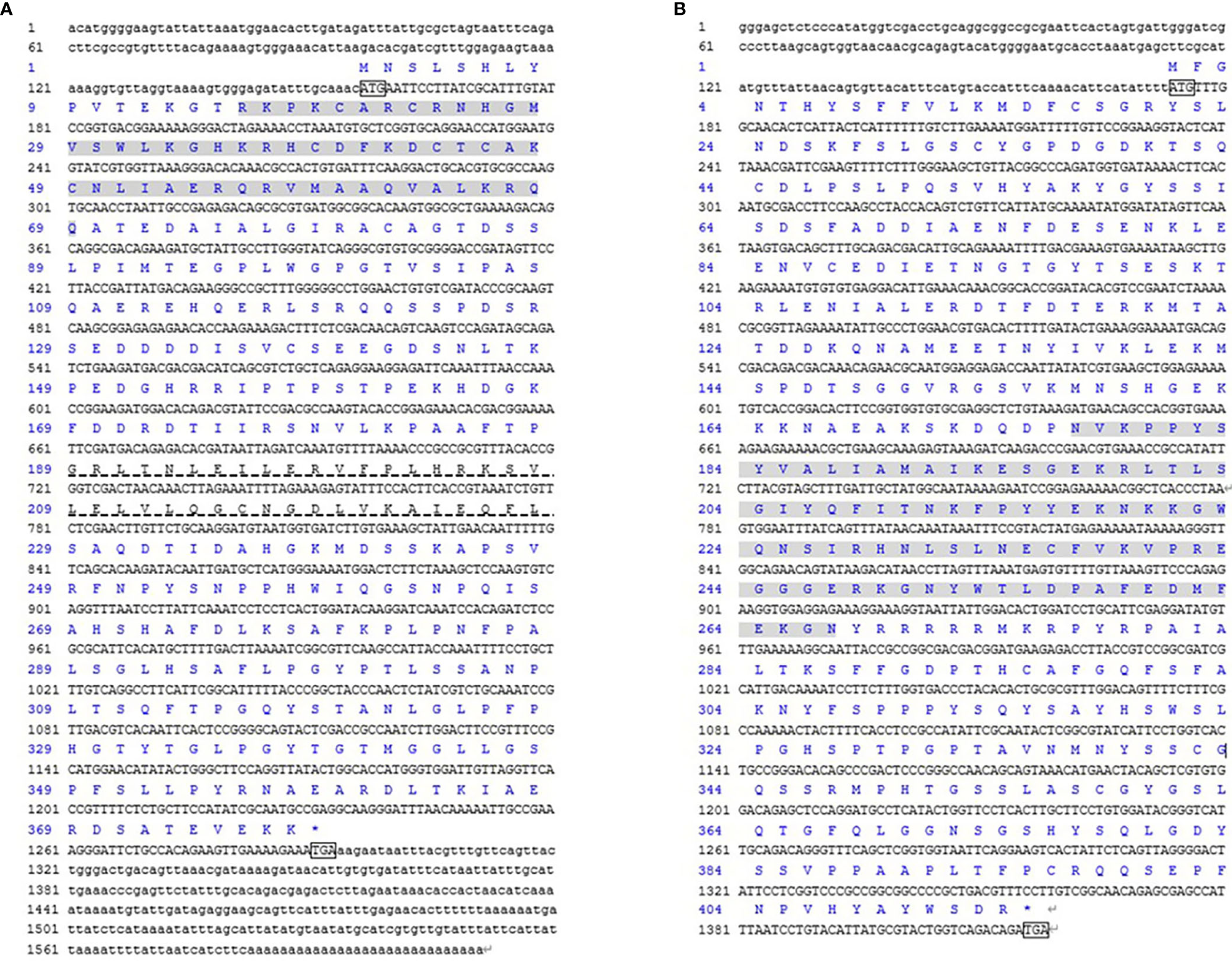 The DMRT3(A) and FOXL2(B) cDNA and deduced amino acid sequence of C. sinensis. The ATG/TGA indicated by the box starts codon/stop codon; shaded regions represent the DM domain and the FH domain, respectively. The DMA domain was indicated by virtual underline.
