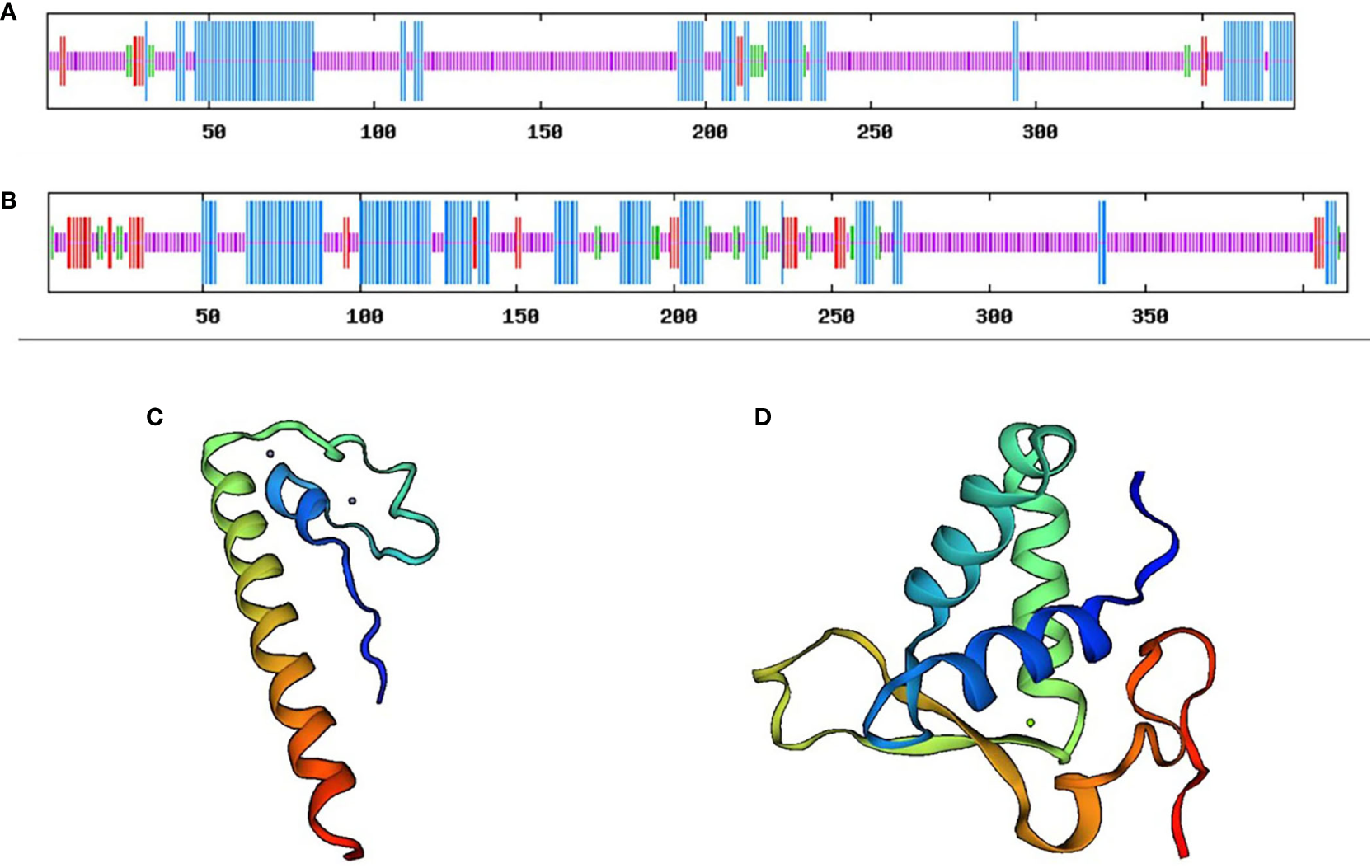 The secondary structure and tertiary structure prediction of DMRT3(A) and FOXL2(B) in C. sinensis. Blue represents the alpha helix, red represents the extended strand, green represents the beta-turn, and orange represents the random coil.