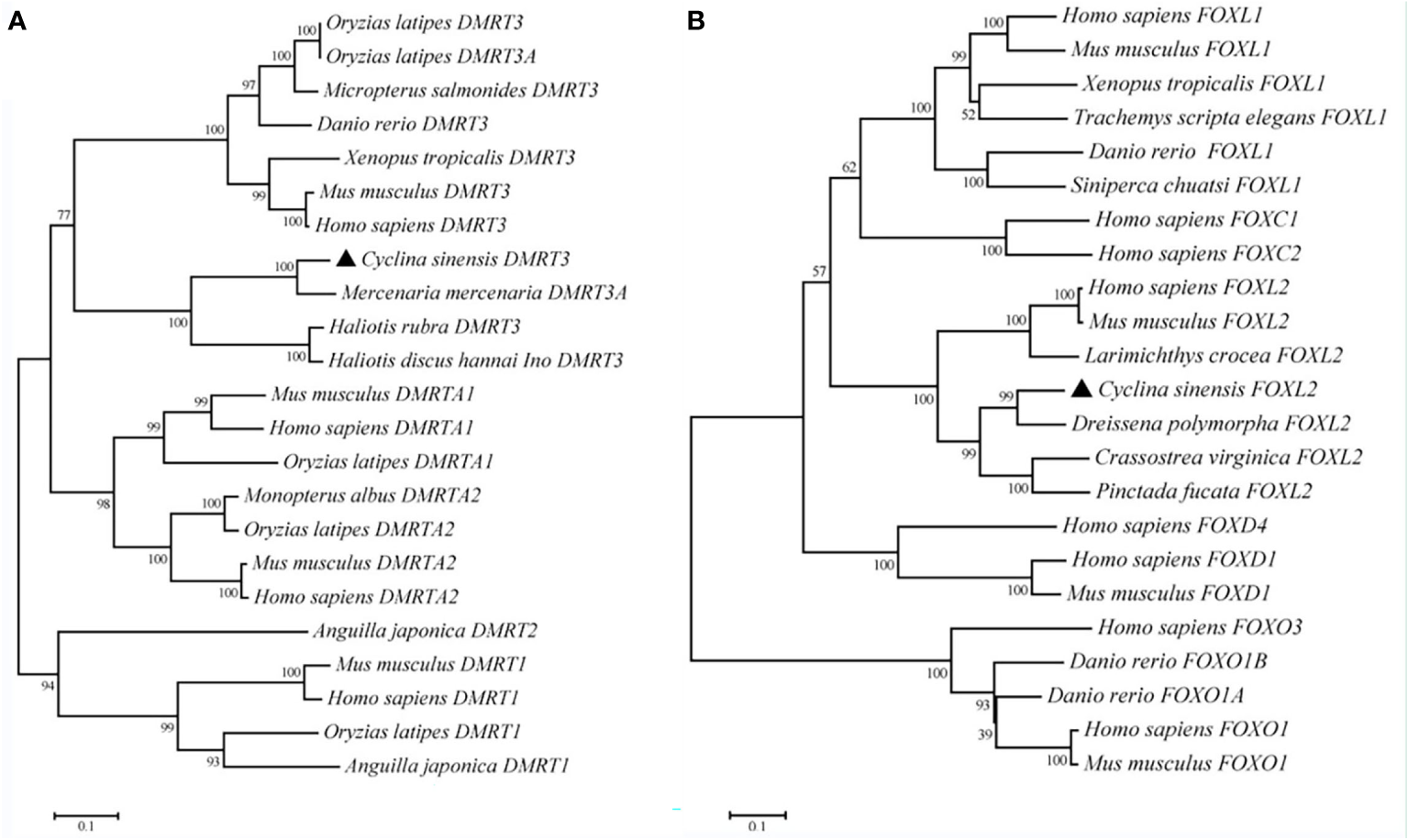 The phylogenetic tree of DMRT3(A) and FOXL2(B) from C. sinensis and other species. Note: C. sinensis were marked by a black triangle.