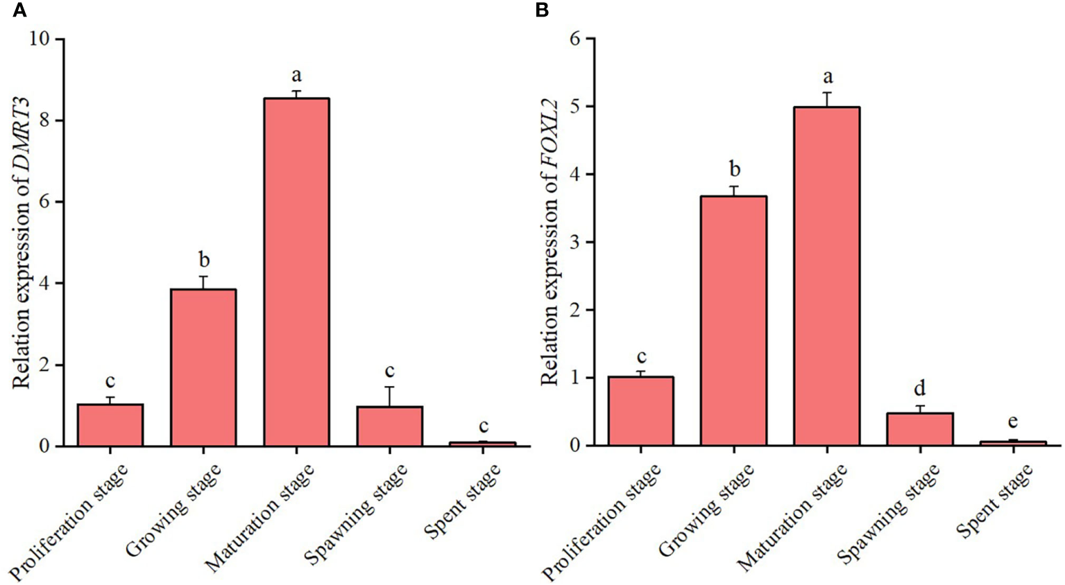 The relative expression levels of DMRT3(A) and FOXL2(B) in the different gonadal developmental stages of C. sinensis. The expression levels of DMRT3 and FOXL2 was only detected in testis and ovary, respectively. Different letters represent significant differences (P<0.05).