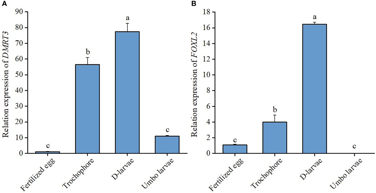The relative expression levels of DMRT3(A) and FOXL2(B) in larval development stages of C. sinensis. Different letters represent significant differences (P<0.05).
