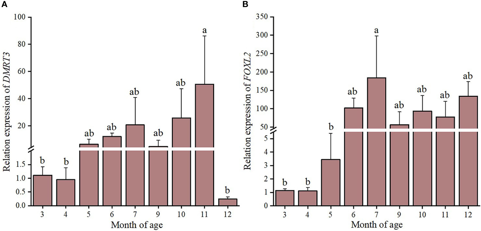 The relative expression levels of DMRT3(A) and FOXL2(B) in different months ages of C. sinensis. Different letters represent significant differences (P<0.05).