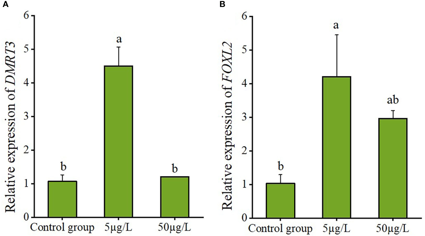 The relative expression levels of DMRT3 in the testis (A) and FOXL2 in the ovary (B) of C. sinensis under estradiol exposure treatments. Different letters represent significant differences (P<0.05).