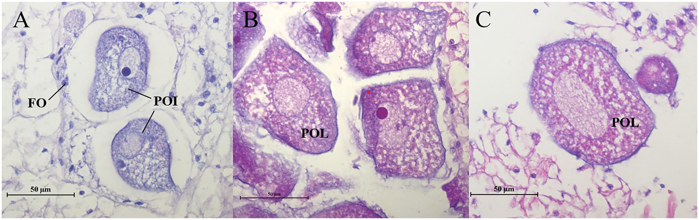 Ovaries histological characteristic of C. sinensis under estradiol exposure treatments. (A) control group, (B) 5 µg/L group, (C) 50 µg/L group. POI, pre-vitellogenesis oocyte; POL, post-vitellogenesis oocyte; FO, follicle cells.